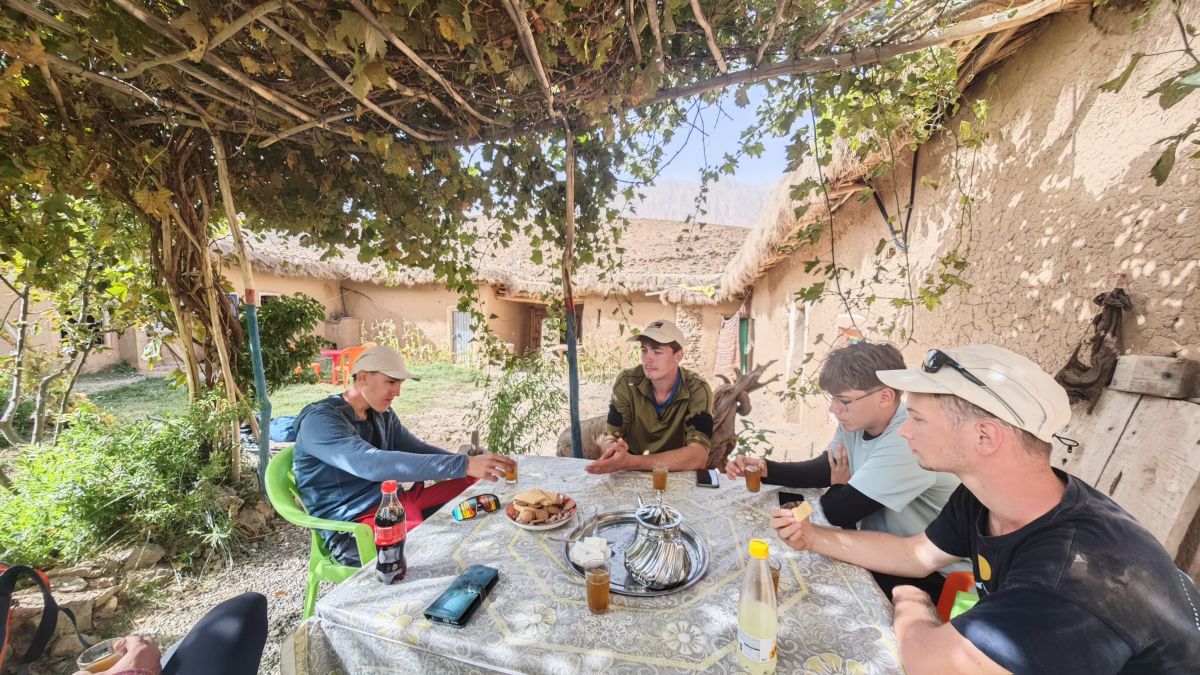 Naša praznična pojedina zato ni bila le obrok oropan kulinaričnih dodatkov sodobnega sveta — bila je nova maroška učna ura. V njej je bilo toliko skrbi, kot je bilo sestavin. Med obrokom se nam zato ni nikamor zares mudilo in nihče ni gledal na uro. Berberi čas merijo drugače: dan je dolg toliko, kolikor ga napolniš; hrana toliko, kolikor jo spoštuješ. Šele ob takšnem obroku človek razume, zakaj se v tej dolini ničesar ne vrže stran in ni razmetavanja z vodo, oljem, kruhom. Vse ima svojo ceno, ki je ne določi trg, ampak narava. Zato je tudi 20 evrov tu druga vrednost — ni plačilo za storitev, ampak prispevek k življenju. Gostoljubje v vaseh Atlasa ni turistična gesta, temveč dogovor: če nekaj vzameš, nekaj prineseš s sabo. Če se vračaš z gora, prineseš zgodbo in spoštovanje, kar je edina valuta, ki tu res šteje, in jo nato le nekaj trenutkov po pojedini vnovčimo za pomoč gostitelja pri počeni zračnici.