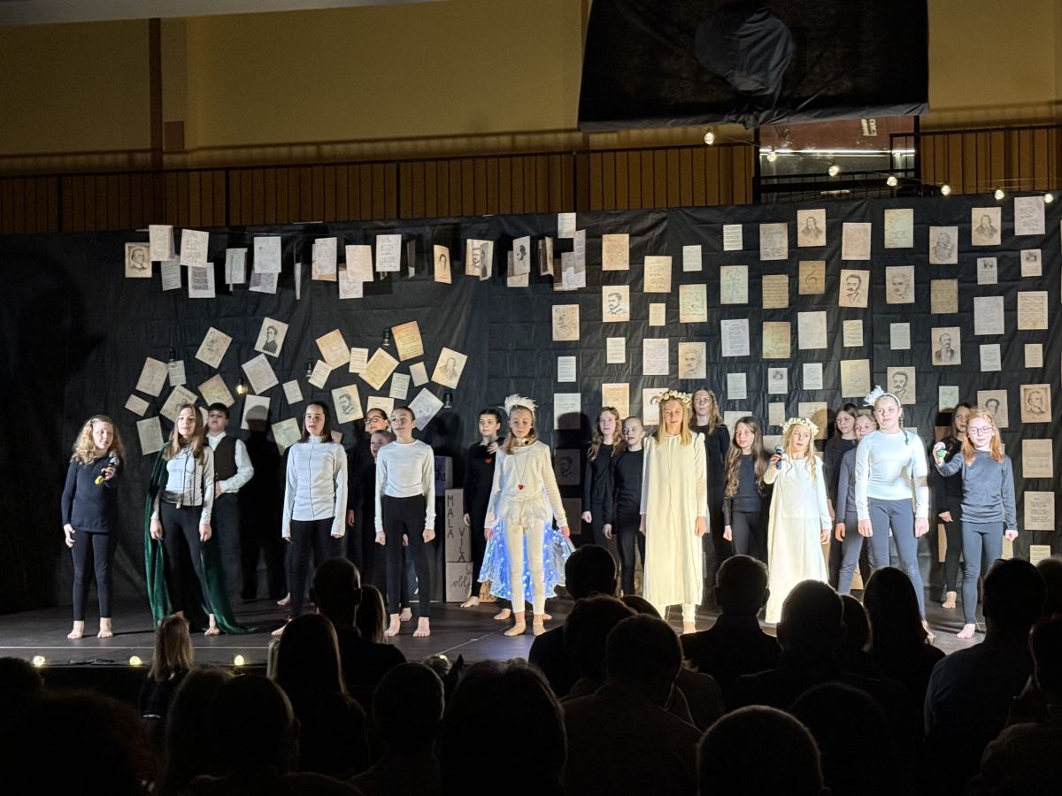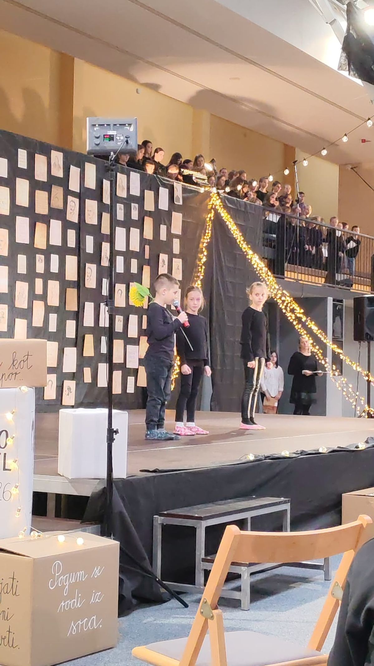 Dvorana je bila polna učencev, učiteljev, staršev in vabljenih gostov, večer pa je zaznamovalo prepletanje poezije, glasbe, gledališča in razmisleka o kulturi ter identiteti.