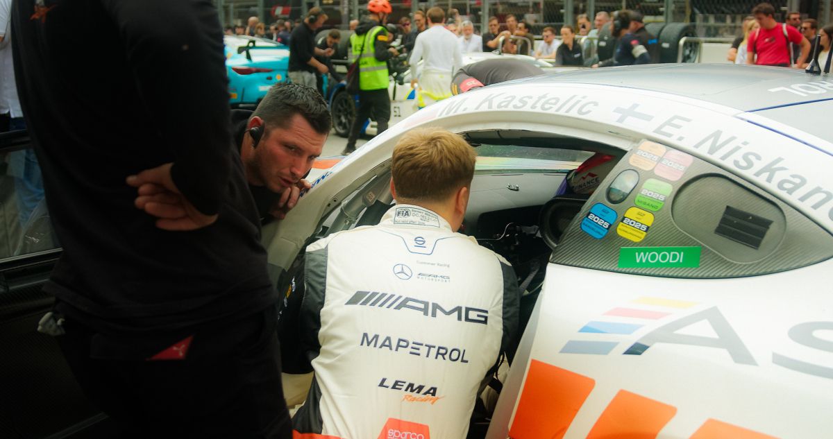 Sledila je dirkaška nedelja, ki je postregla z izjemno gnečo v paddocku in z številnimi navijači in ljubitelji avtomobilizma, ki so prišli na ogled dirkaškega spektakla v Montmelu. Vreme je bilo nekoliko slabše in celo nekaj dežja so videli dirkači. No, na srečo je dirka v tekmovalnem razredu GT4, kjer vozita Kastelic in Niskanen ostala suha, a ne glede na to, pa tudi tokrat ni šlo brez zapletov.
