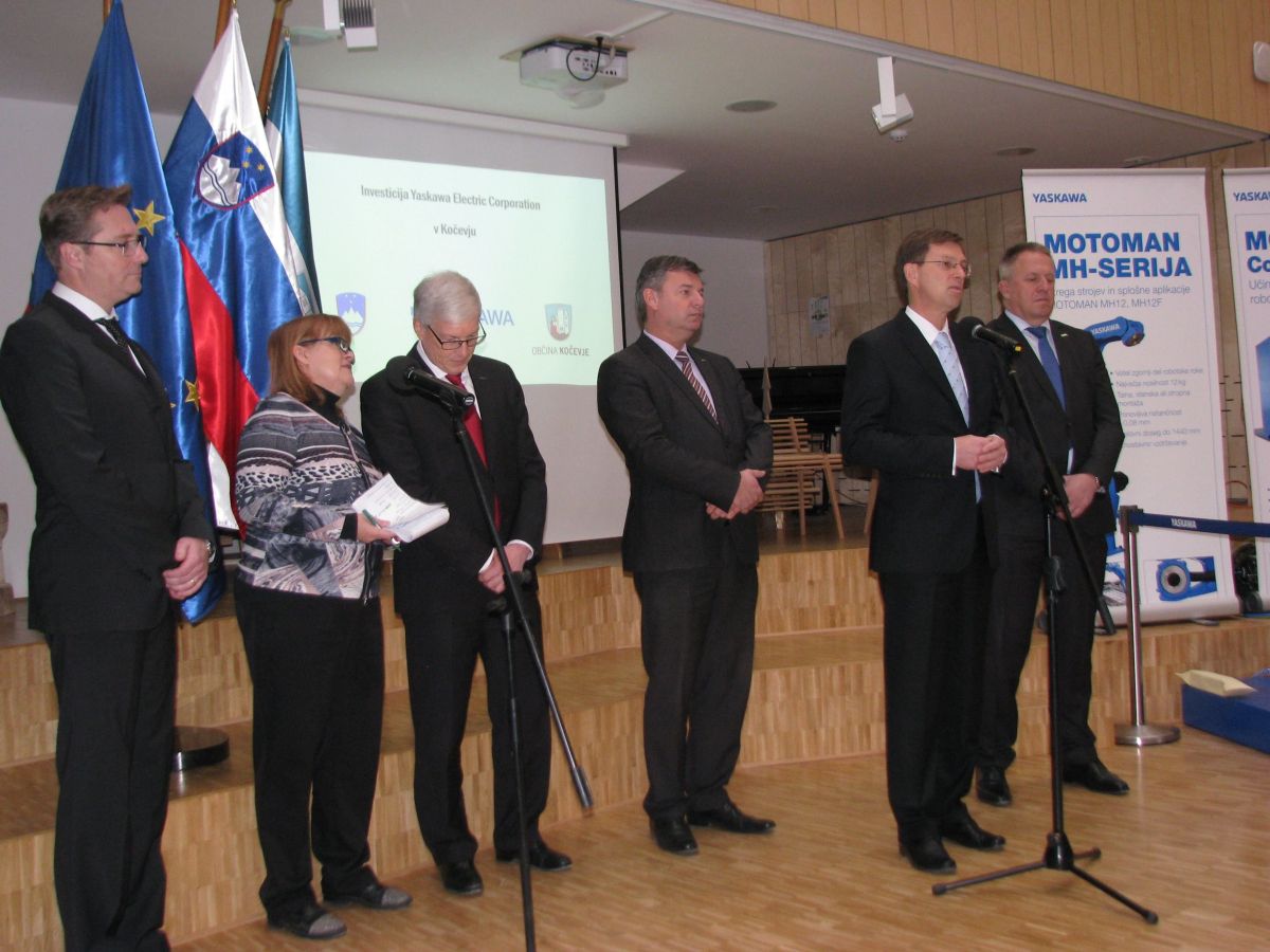 Predsednik vlade Miro Cerar, minister za gospodarski razvoj in tehnologijo Zdravko Počivalšek, minister za infrastrukturo Peter Gašperšič, predsednik Yaskawa Europe in podpredsednik Yaskawa Electric Corporation Manfred Stern in župan občine Kočevje Vladimir Prebilič so na današnji tiskovni konferenci v Kočevju uradno obelodanili odločitev japonskega koncerna Yaskawa, da bo svojo novo tovarno robotov zgradil v Kočevju. Ob tem so predstavniki vlade, ki so se v Kočevju sestali na delovnem obisku s predstavniki občine in Yaskawe, predstavili tudi aktivnostih vlade RS na področju spodbujanja neposrednih tujih investicij.
