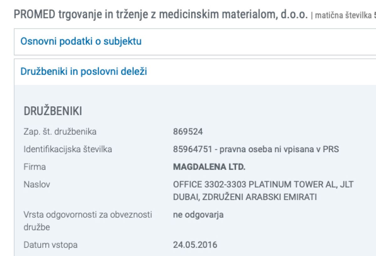 Edini lastnik Promeda je od leta 2016 družba Magdalena Limited. Registrirana je v Dubaju, ki je v zadnjem desetletju postalo priljubljeno pribežališče slovenskih podjetnikov v težavah. O tej družbi iz javno dostopnih podatkov ni mogoče izvedeti ničesar. Domnevati gre, da je njen edini namen brisanje sledi za lastništvom Promeda.