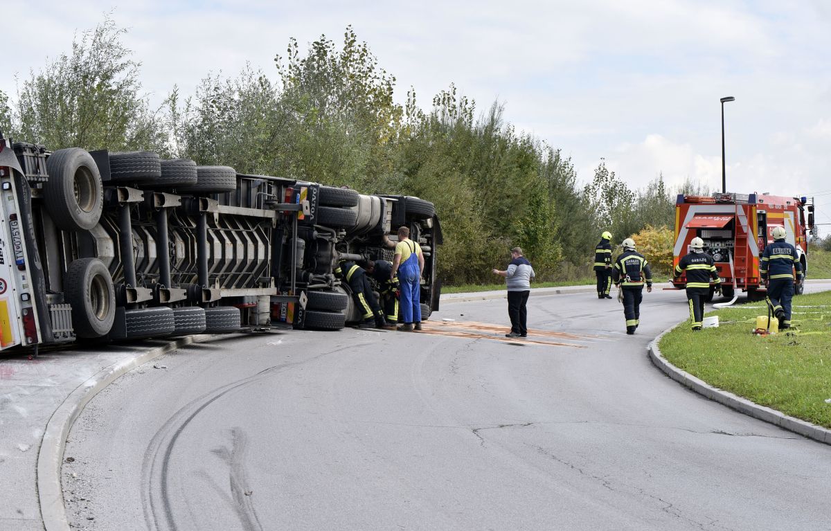 Gasilci so iz prevrnjenega tovornjaka s tehničnim posegom rešili ujete voznika. Ob tem so zatesnili iztekanje gorica iz cevi, odklopili akumulatorja na vozilu, posuli iztekle tekočine ter nudili pomoč avto vleki pri postavitvi tovornjaka na kolesa.
