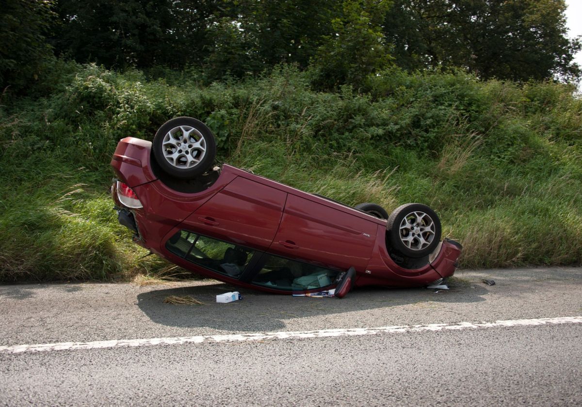 Zaradi neprilagojene hitrosti je voznik zapeljal s ceste, ob tem pa se je avtomobil na nasipu prevrnil na streho.