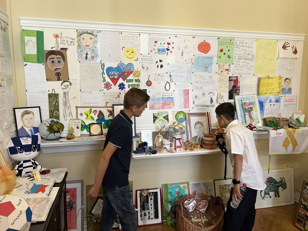 Predsedniku RS smo ob prihodu v dvorano namenili topel aplavz. Pozdravil nas je z nasmeškom in nam izrekel prisrčno dobrodošlico. Pohvalil nas je za nagrajene pesmi in spise in za to, da negujemo ljubezen do domovine. Na stopnišču dvorane smo se še vsi fotografirali s predsednikom, nato pa nas je povabil še na ogled drugih prostorov. Ogledali smo si Sobo 70 ali rdečo dvorano, v kateri potekajo delovni pogovori več udeležencev. Nato smo vstopili v Zlati salon (prostor z zlatimi štukaturami), ki je namenjen pogovorom predsednika s tujimi voditelji na štiri oči. Zanimiv prostor je tudi Otroški kotiček, v katerem so številna pisma, risbice in drugi domiselni izdelki, ki so jih otroci podarili predsedniku. Ogled smo nadaljevali skozi dvorane štirih izjemnih slovenskih politikov: Franceta Bučarja, Ivana Omana, Jožeta Pučnika in Janeza Drnovška. Na osrednjem hodniku Urada predsednika RS so našo pozornost pritegnila čudovita protokolarna darila, ki jih je predsednik Pahor prejel v dveh mandatih svojega predsedovanja iz mnogih držav sveta. Stene Palače pa krasi še bogata zbirka umetniških slik. Na eni steni so tudi fotografije vseh treh predsednikov RS, ki so bivali v Palači pred sedanjim predsednikom.