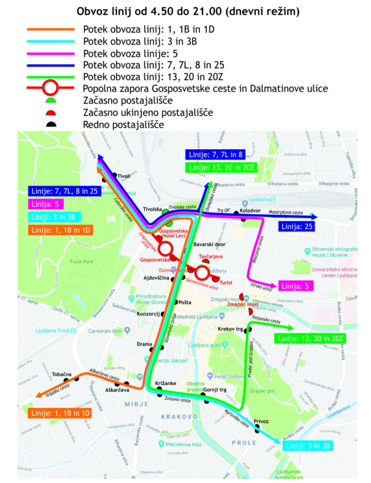 Mestni avtobusi bodo vozili po spremenjenih trasah. Na Tivolski cesti bo urejeno začasno avtobusno postajališče, tista na Gosposvetski cesti in Dalmatinovi ulici pa bodo v času zapore ukinjena.