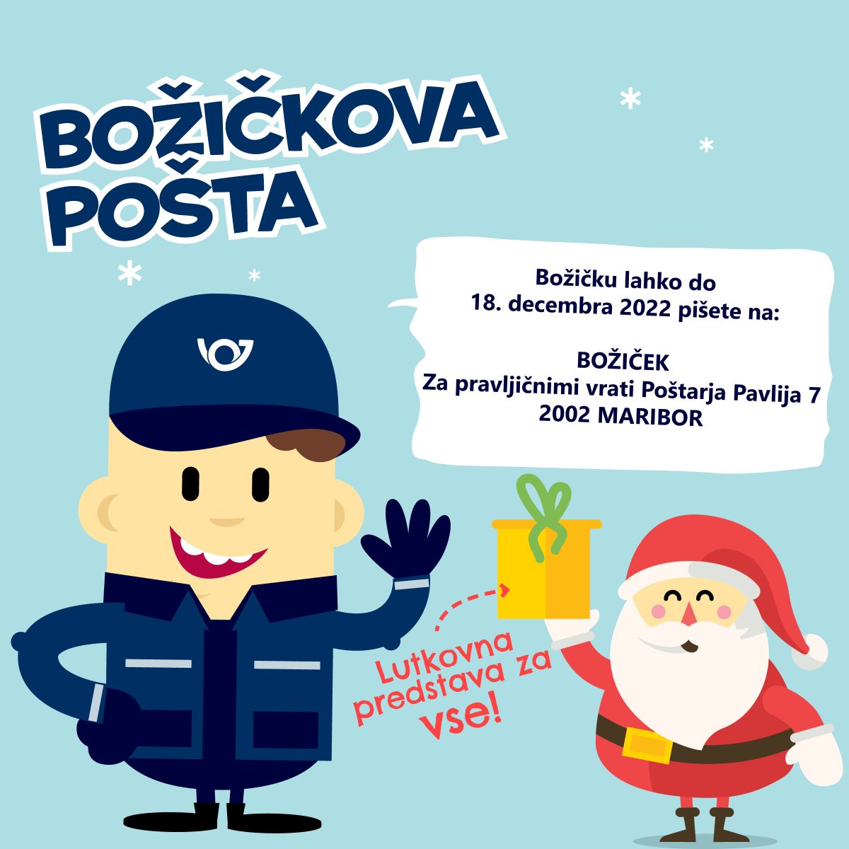 Letos vsem otrokom podarja virtualni ogled pravljice Zajčkova hišica, ki jo izvaja Lutkovno gledališče Ljubljana. Pravljica bo med 12. decembrom in 4. januarjem na ogled na povezavi posta.si/bozickova-posta, govori pa o tem, kako se lahko vsak od nas kdaj znajde v stiski in brez strehe nad glavo, in o tem, kako lepo in pomembno je, da si takrat pomagamo.