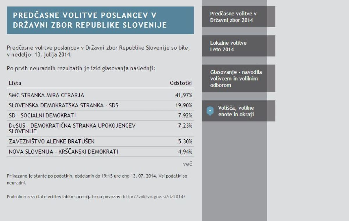 Po delnih neuradnih izidih volitev v DZ, ki jih je objavila Državna volilna komisija (DVK) po preštetih 99,97 odstotka glasovnic, je SMC relativna zmagovalka predčasnih parlamentarnih volitev, saj so ji volivci namenili 34,61 odstotka glasov oziroma 36 sedežev v DZ. Na drugem mestu je SDS, ki je dobila 20,96 odstotka glasov oziroma 21 sedežev.