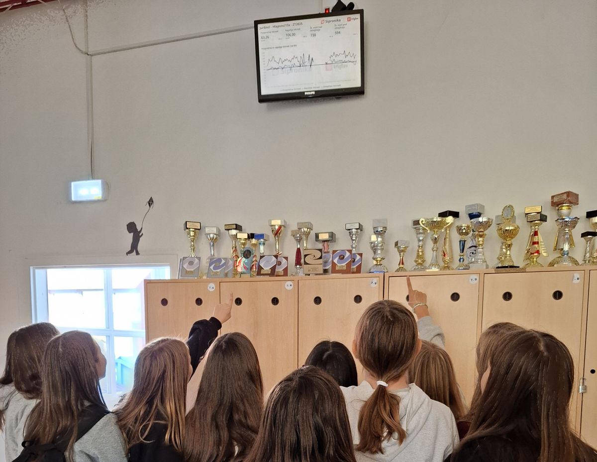 Rezultate meritev lahko z enodnevnim zamikom spremljajo učenci na ekranu v šolski avli.