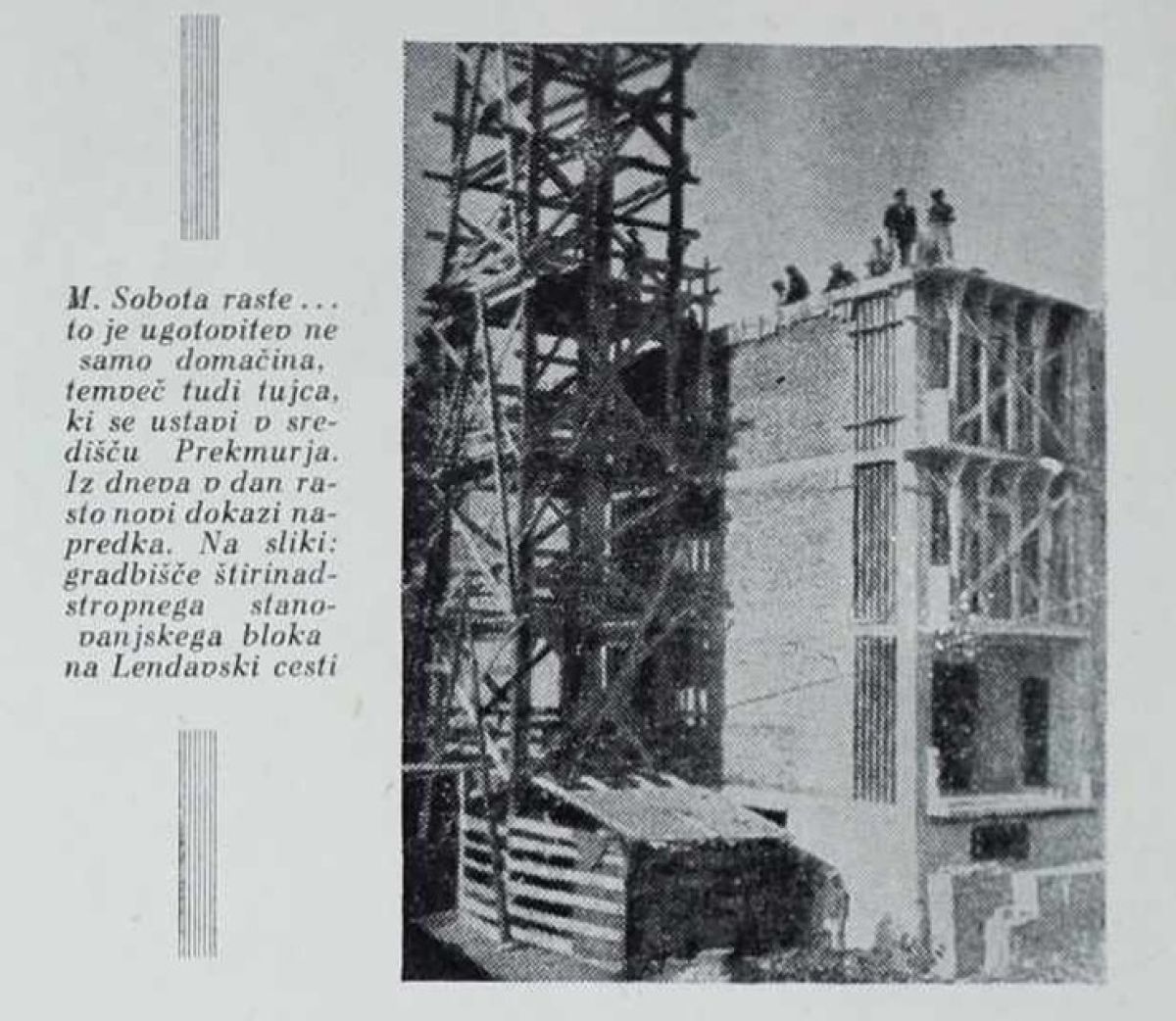 Če izvzamemo sakralno arhitekturo, je bil prvi znanilec urbane vertikale na soboški ravnici prav soboški nebotičnik. Prvi prebivalci so se vselili ob desetletnici osvoboditve, novembra 1955. Takrat je bilo v jugoslovanskem grbu zgolj še pet plamenic. Prebivalec z najdaljšim statusom v bloku je Zoran Vidic, eden redkih »originalov« bi lahko rekli, ki so ga v ta blok prinesli kot dvomesečnega dojenčka in še danes prebiva v bloku. Vsekakor zanimiv sogovornik, ki je v tej stavbi odrastel in je živa priča ne zgolj življenja v tem bloku, ampak pričevalec urbanističnega razvoja tega dela mesta.