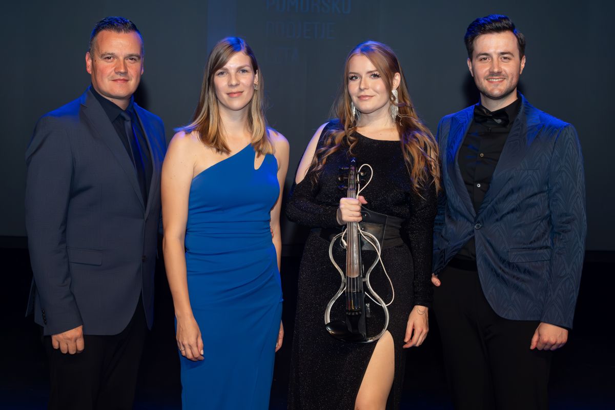 Na slovesnem dogodku sta nastopila violinistka Ekaterina Lepoša in vokalist Aljaž Ramot, na fotografiji s povezovalcema programa Andrejem Mernikom in Majo Hajdinjak, ki jo nedvomno bolj poznate kot novinarko Vestnika.
