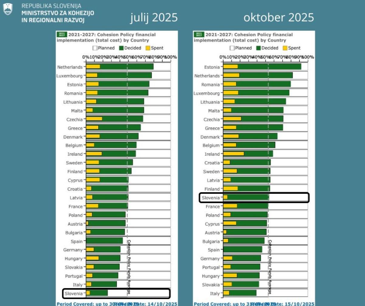 Na ministrstvu poudarjajo, da proaktivno spremljajo izvajanje kohezijskih projektov in poročajo vladi, zato so septembra predlagali že drugo spremembo Programa evropske kohezijske politike 2021-2027, ki jo je vlada že tudi potrdila. "Z načrtovano spremembo programa evropske kohezijske politike 2021-2027 se Slovenija prilagaja novim razvojnim in strateškim prioritetam Evropske unije ter lastnim nacionalnim potrebam. Ključni razlog za spremembo je učinkovitejša uporaba razpoložljivih sredstev, s katero želimo zagotoviti večjo usmerjenost v področja z največjim razvojnim učinkom. Nova prednostna področja, ki jih omogoča tudi septembra sprejeta kohezijska uredba, so konkurenčnost, energetski prehod in energetska varnost, obramba in varnost, dostopna stanovanja ter vodna odpornost in oskrba. Spremembe prinašajo tudi večjo finančno in upravno fleksibilnost. V podporo uresničevanju ciljev Slovenije na novih in spremenjenih področjih načrtujemo prerazporeditve sredstev iz obstoječih na nove ukrepe kohezijske politike v skupni vrednosti 241 milijonov evrov," so napovedali na ministrstvu.
