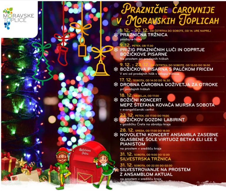 Številne prireditve v okviru sklopa Praznične čarovnije v Moravskih Toplicah 2022 med 9. in 31. decembrom 2022 v organizaciji TIC Moravske Toplice.