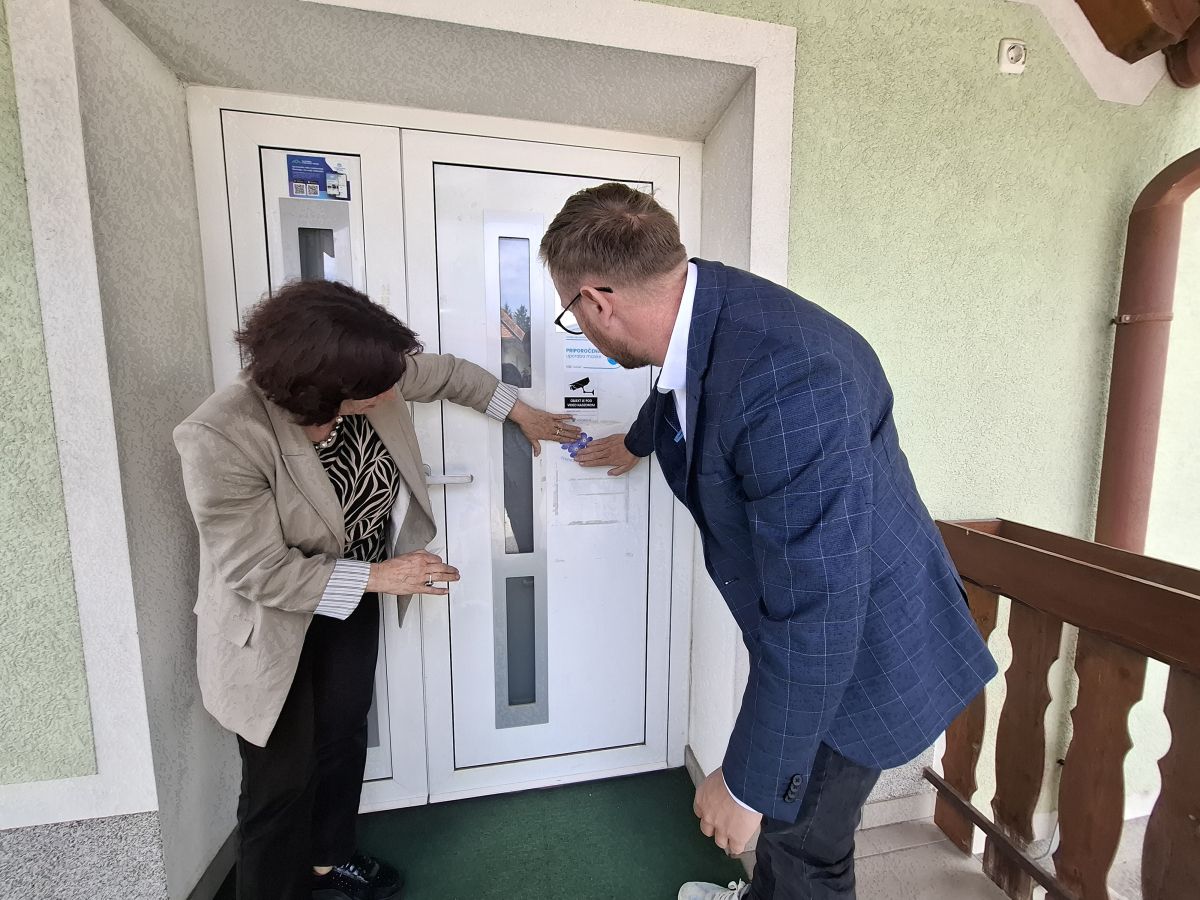 Na vhodna vrata hodoške občine so prilepili nalepko treh spominčic, ki opozarjajo na demenci prijazno točko.