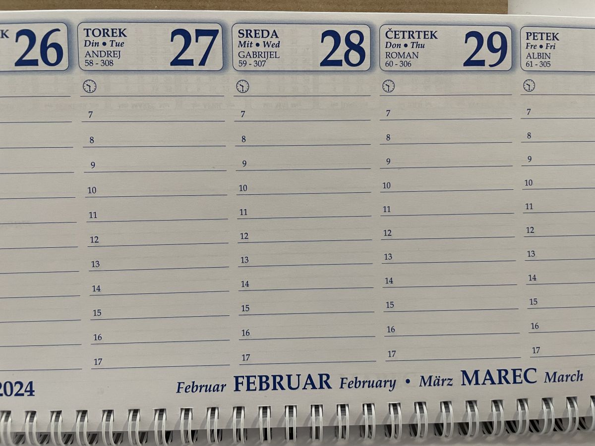 Tako kot vsa leta do sedaj, od otroštva v Beltincih, ko nam je pri babici nosil koledarje dimnikar Miška, tudi vsa leta pozneje tukaj v mestu dimnikarji prinesejo velik potiskan list s kičastim motivom. Na sumu imam sicer, da je letošnjo štiriperesno deteljico še malo ozaljšala umetna inteligenca. In kot vsako leto sem bila tudi te dni v dilemi, kam spraviti to numerično napoved, ki nam bo odštevala dneve novega leta, ko pa imamo še nekaj dni starega.