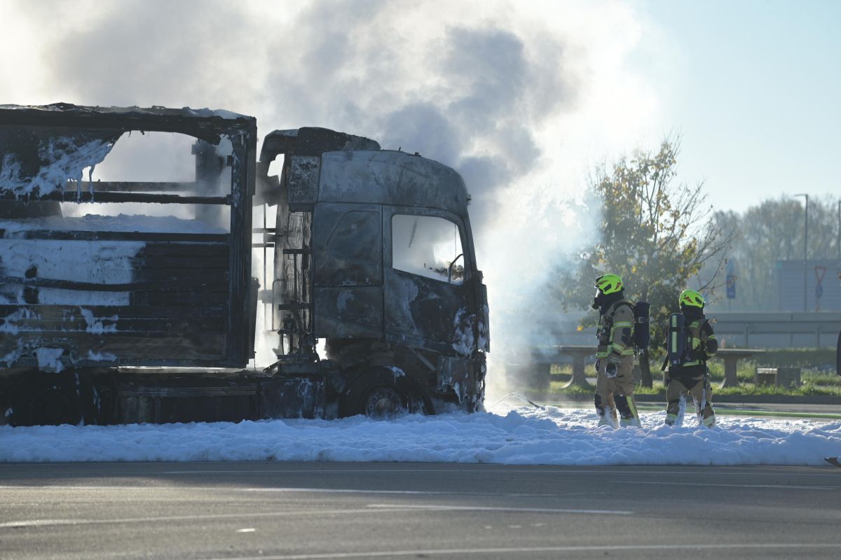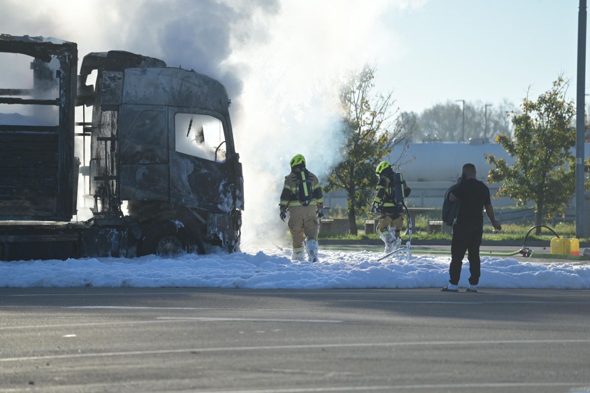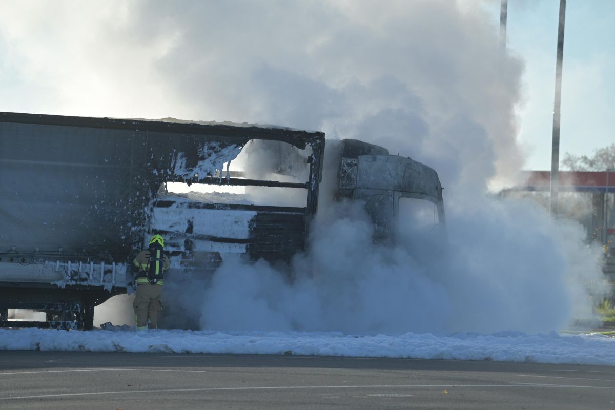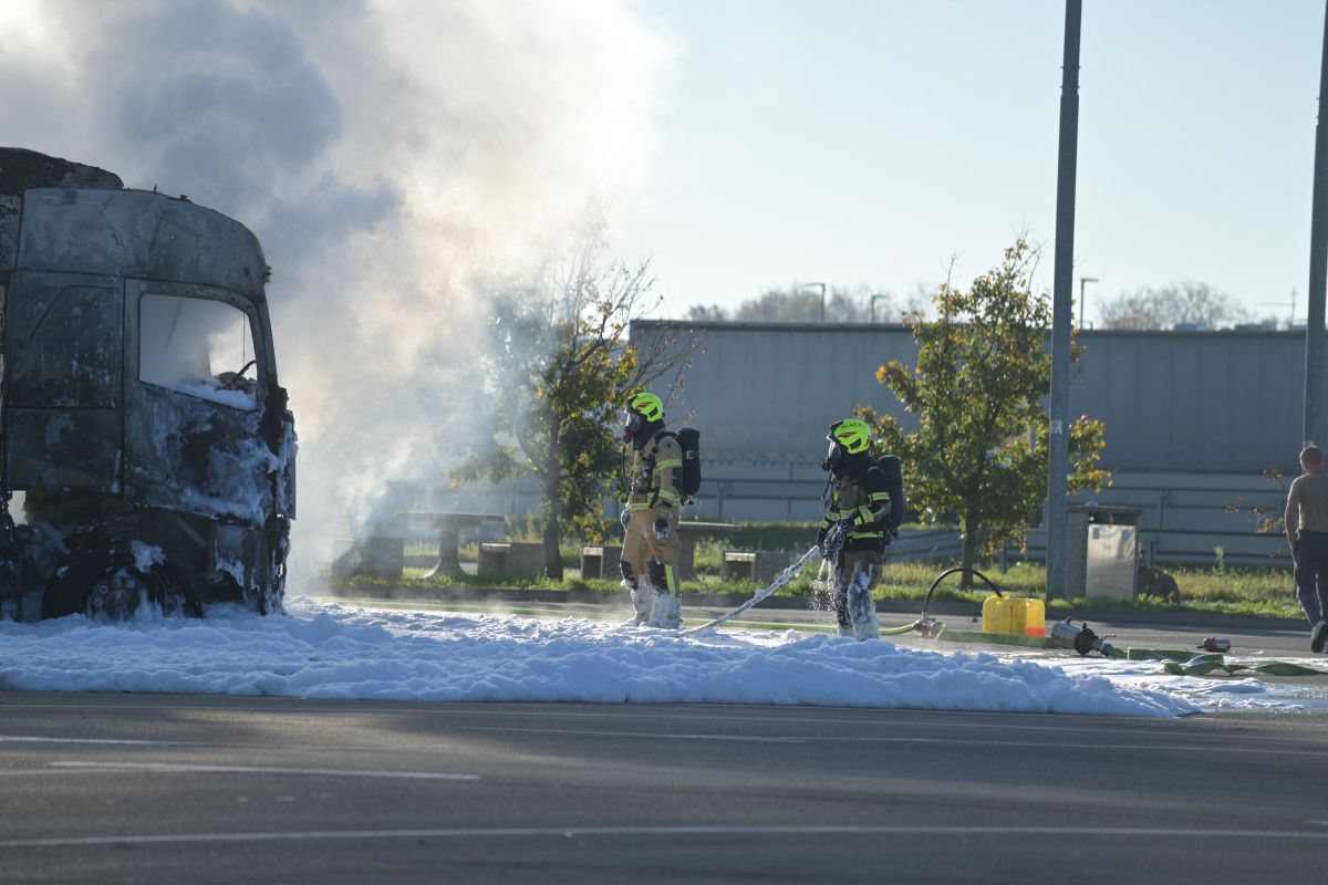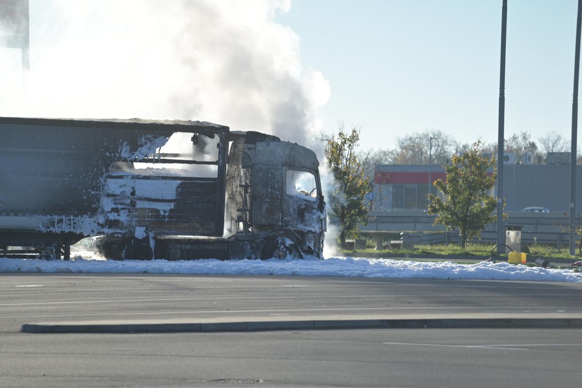 Foto in video: Na avtocestnem počivališču ogenj zajel tovornjak