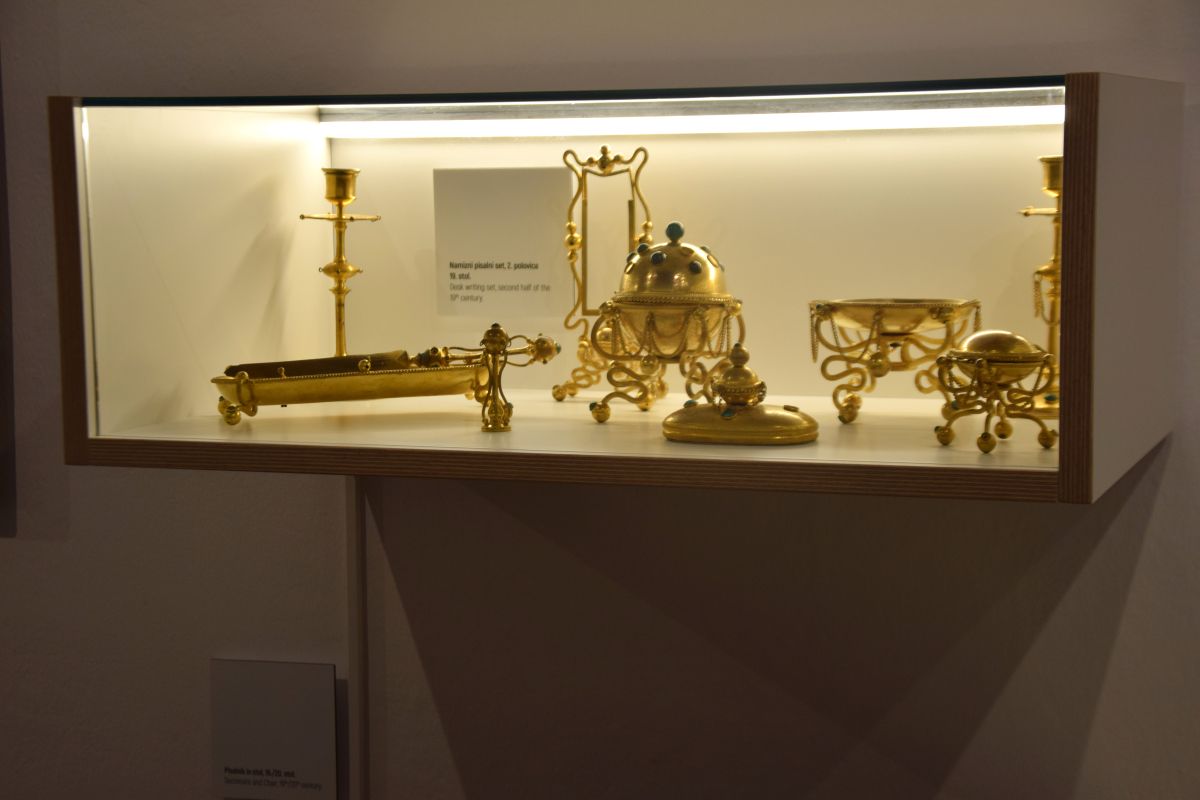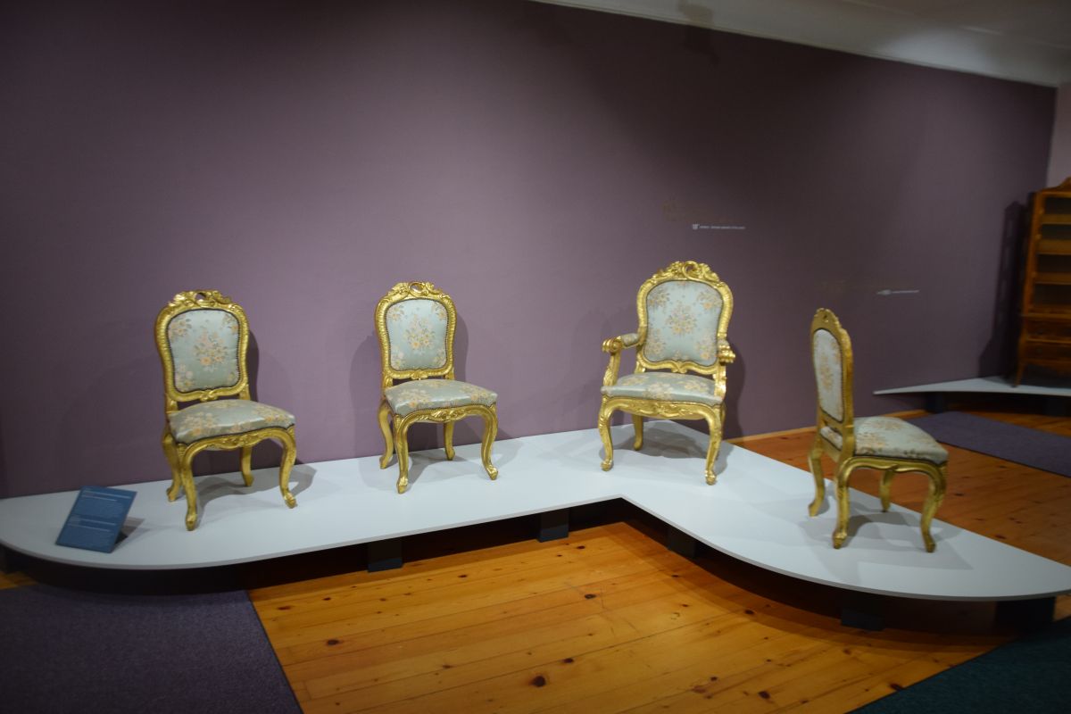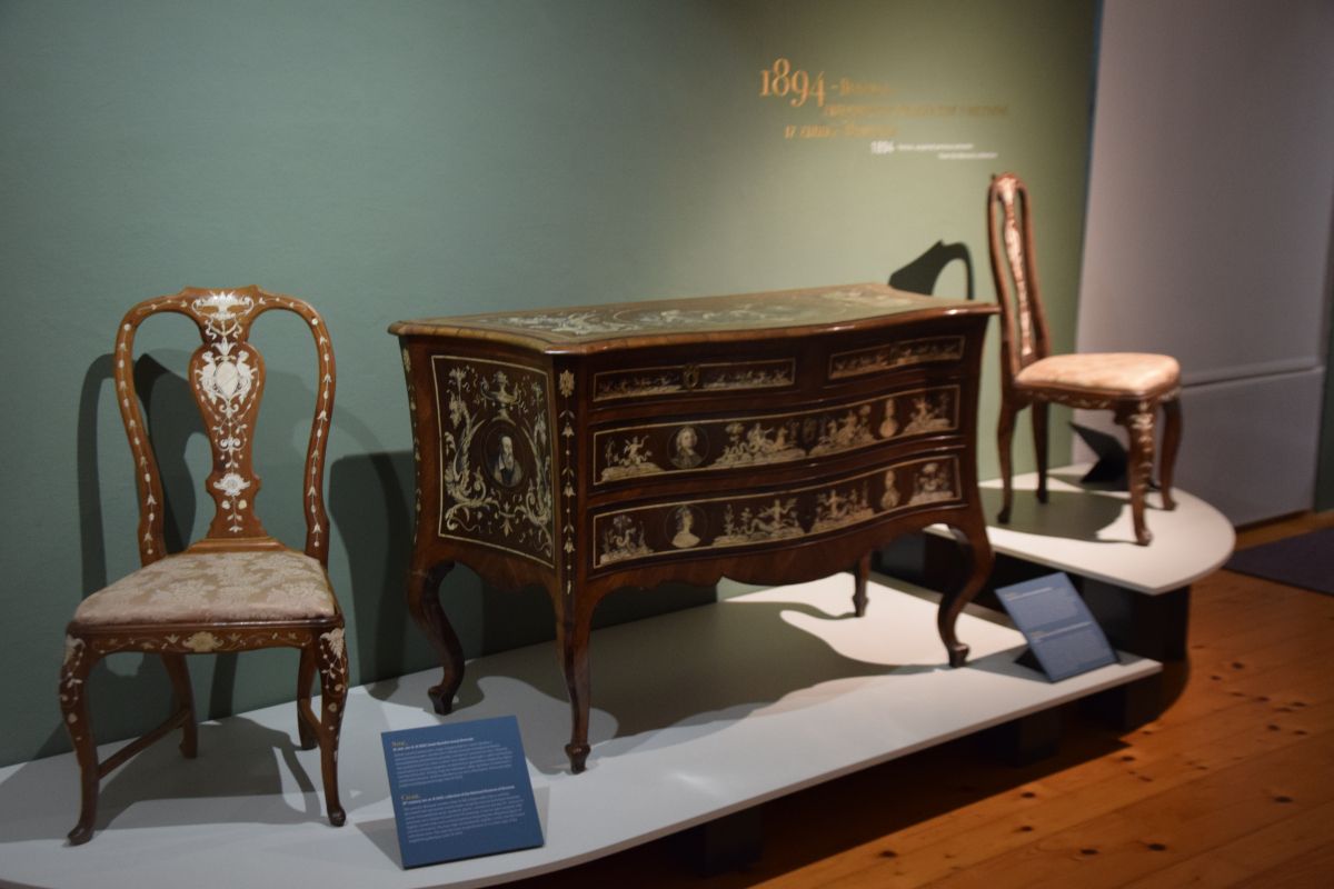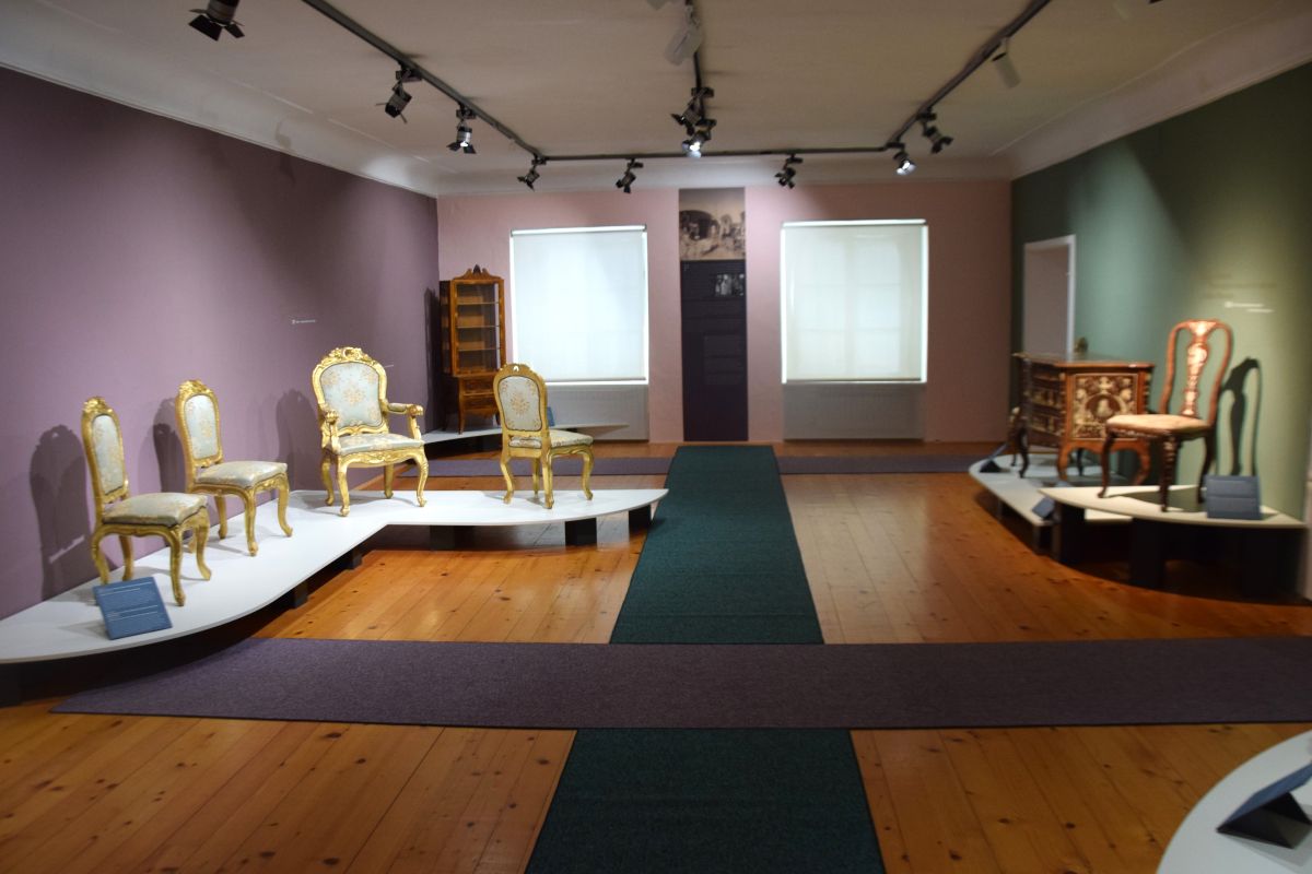 Na začasni razstavi je skupno 28 predmetov, poleg pohištva gre še za nekaj manjših kosov opreme, denimo peterokraki svečnik girandole in visečo uro, ob teh pa so na ogled še družinski portreti. Nekateri od teh so nekoč viseli tudi v izvirni sobi Marije Terezije, kjer je danes urejena zbirka o rokodelstvu, kako je soba izgledala nekoč, pa lahko vidimo na fotografiji rekonstrukcije nadvojvodinjine sobe na enem od razstavnih panojev (rekonstruirana soba pa je na ogled v muzeju Joanneum). "Predmeti so lokalna dediščina, ki pa ima ne samo državni, temveč tudi mednarodni pomen. Gre namreč za eminentne kose; preden so predmete leta 1930 prodali na dražbi, se je o soboškem gradu pisalo kot o najbolj bogati in razkošno opremljeni poletni plemiški rezidenci v okviru tedanje Kraljevine SHS," tako Tamara Andrejek, ki se je v svojem prispevku v katalogu osredotočila na kose te izvirne opreme, ki jih imajo v zbirki Pomurskega muzeja; večina se jih nahaja v baročnem salonu, nekaj osebnih, drobnih predmetov pa je vključenih v prenovljeno stalno razstavo Ljudje ob Muri.