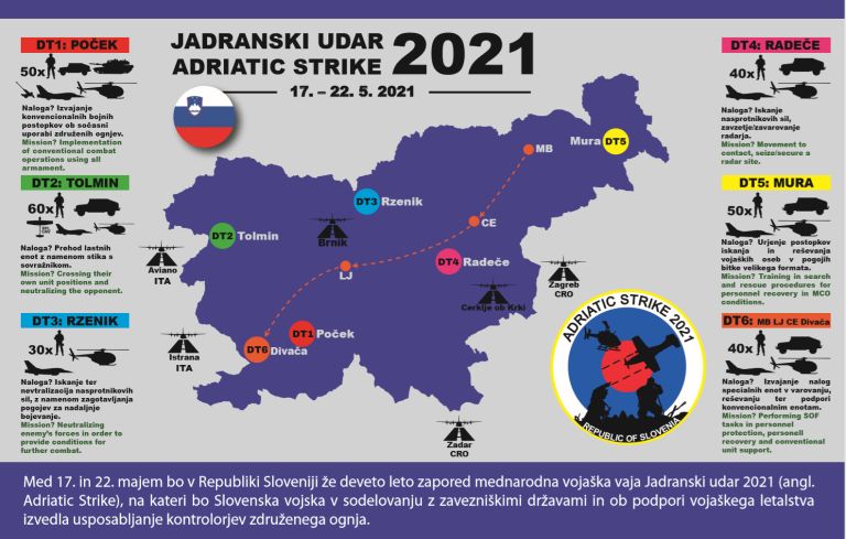Do sobote v Sloveniji poteka mednarodna vojaška vaja Jadranski udar 2021. Že deveto leto zapored Slovenska vojska v sodelovanju z zavezniškimi in partnerskimi državami in ob podpori vojaškega letalstva izvaja usposabljanje kontrolorjev združenega ognja.
