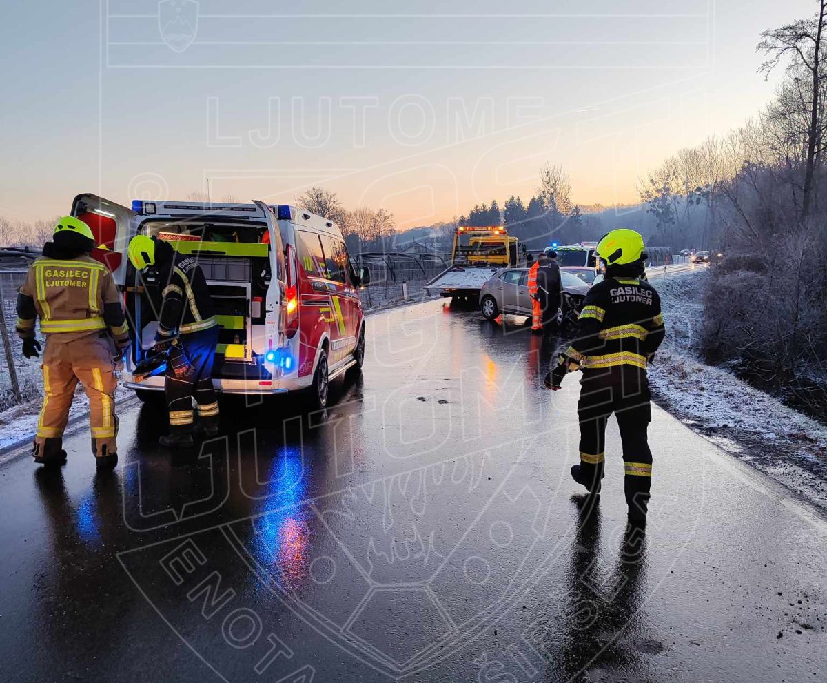 Na isti cesti, a tokrat bližje vasi Veščica, sta nato malo po 7. uri trčili osebni vozili. Na teren so morali znova gasilci PGD Ljutomer, ki so poskrbeli za najnujnejše ukrepe in reševalcem pomagali pri oskrbi dveh poškodovanih oseb.