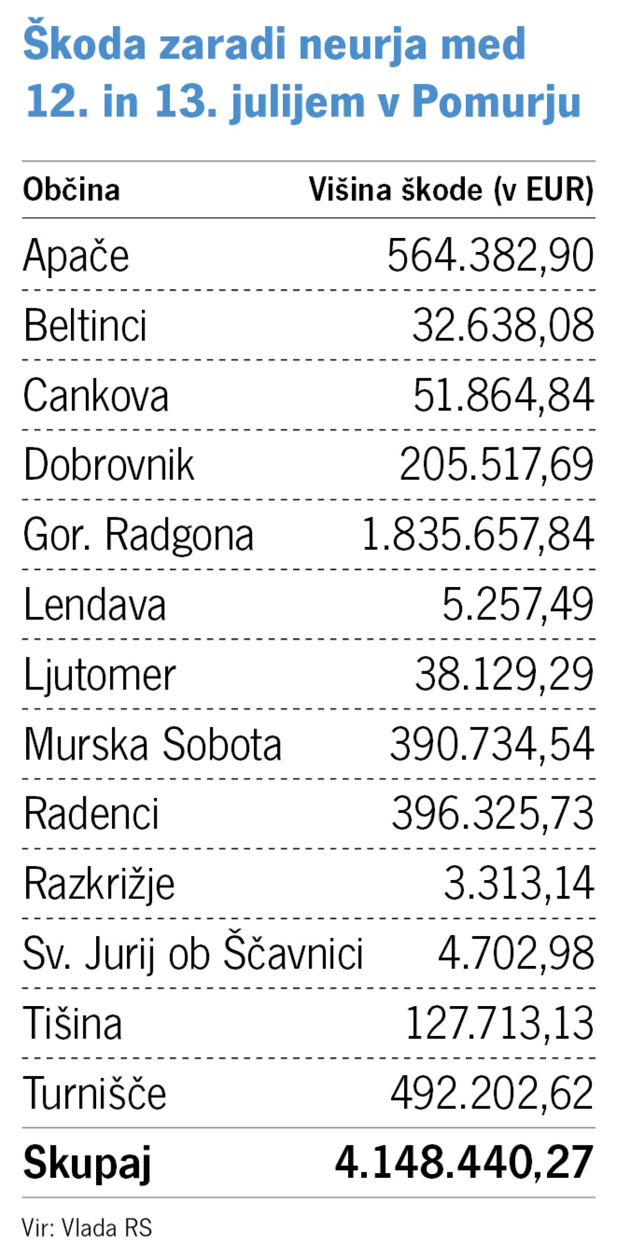 Državna komisija je sredi septembra potrdila oceno neposredne škode zaradi posledic močnega neurja z dežjem, poplavami in vetrom med 12. in 13. julijem. V 90 slovenskih občinah so ugotovili gmotno škodo v višini slabih 38 milijonov evrov. V Pomurju, kjer je bilo prizadetih 13 občin, škoda znaša 4,1 milijona evrov, večinoma gre za škodo na stavbah.
