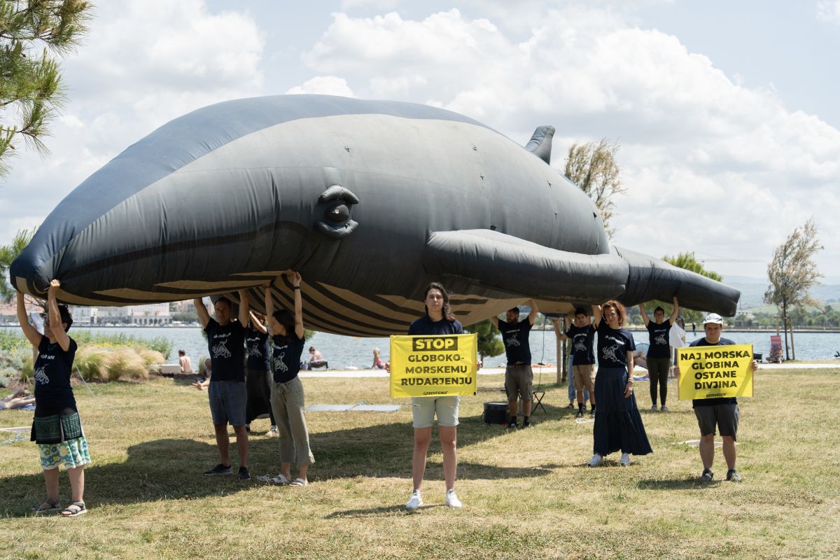 V nevladni organizaciji Greenpeace Slovenija so danes v Kopru s postavitvijo napihljivega kita v naravni velikosti in zvočno instalacijo simbolično opozorili na nujnost zaščite oceanov.