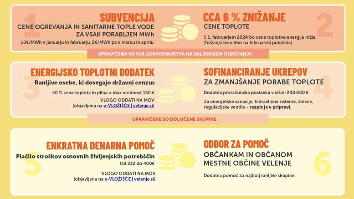 V okviru ukrepov za lajšanje finančne stiske občanom zaradi povišanih stroškov ogrevanja bodo lokalne skupnosti vsem gospodinjstvom, ki so na daljinskem ogrevanju, subvencionirale ceno ogrevanja in sanitarne tople vode 10 evrov za 1 MWh (v mesecu januarju in februarju za 10 evrov/MWh, v mesecu marcu in aprilu za 5 evrov/MWh) in za cca 6 % znižali ceno toplote, saj je TEŠ s 1. januarjem 2024 znižal ceno energije (z učinkom na februarski položnici).