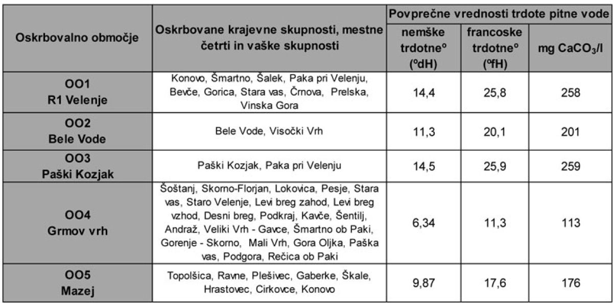 Uporabnike pitne vode v Šaleški dolini oskrbujemo iz 5 oskrbovalnih območij, ki se napajajo iz različnih vodnih virov. Voda ima trdoto med 6 in 15°dH (nemških stopinj) in spada tako med srednje trde vode. Se pa trdota vode nekoliko razlikuje po posameznih oskrbovalnih območjih znotraj Šaleške doline, kar je razvidno iz spodnje tabele. Vrednosti za trdoto vode so podane v različnih enotah, ker različni proizvajalci aparatov podajajo trdote v različnih enotah.