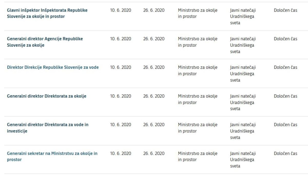 Da želi vlada na tem področju delovati brez nasprotnikov, kaže tudi kadrovski cunami, ki je te dni zadel ministrstvo za okolje in prostor ter njegove službe. Ministrstvo za okolje je tako objavilo razpise za položaje glavnega inšpektorja za okolje, generalnega direktorja Arsa, direktorja direkcije za vode, direktorja direktorata za okolje, generalnega direktorja direktorata za vode in investicije ter generalnega sekretarja na ministrstvu za okolje in prostor.