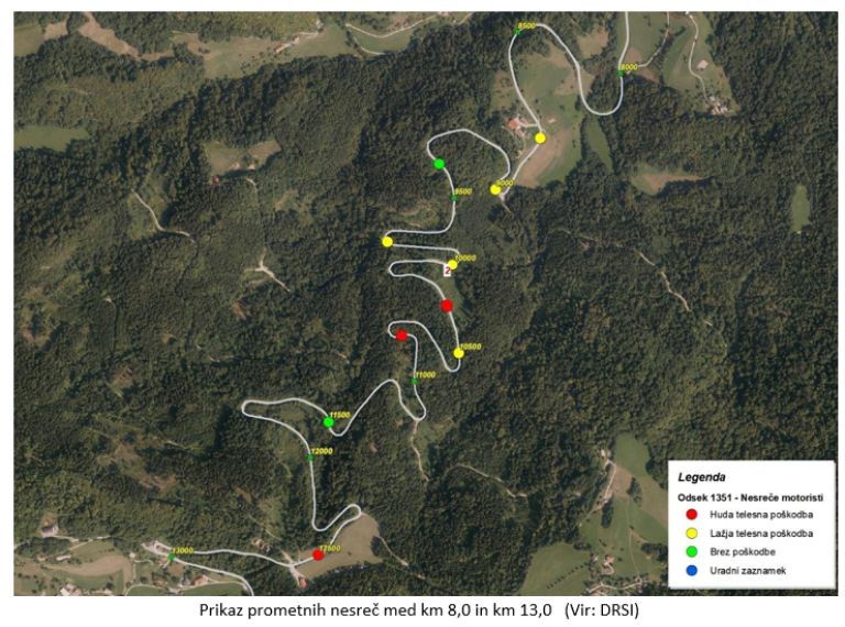 Lani se je na slovenskih cestah pripetilo 1.061 prometnih nesreč z udeležbo voznikov enoslednih motornih vozil oz. 13 % več kot v letu 2018. V omenjenih prometnih nesrečah je umrlo 23 voznikov enoslednih motornih vozil oz. 5 več kot v letu 2018. V Sloveniji imamo na državnih cestah 41 nevarnih cestnih odsekov za motoriste, na 9 mestu med njimi je odsek Trbovlje – Latkova vas ali po domače cesta čez Podmejo. Izsledki analize prometne varnosti kažejo, da se je na tem odseku med letoma 2014 in 2019 zgodilo 25 prometnih nesreč, podatki bi bili še dosti slabši v kolikor bi bile evidentirane vse prometne nesreče motoristov, tudi padci, Veliko prometnih nesreč s padci in poškodbami ostane neidentificiranih, saj motoristi ne prijavijo dogodka in kraja nesreče, ter ne pokličejo policije. Na cesti so prisotna tako osebna vozila kot tudi avtobusi, saj veliko ljudi dnevno migrira na delo iz Zasavja v Prebold in nazaj. Predvsem med vikendi pa se poveča tudi število motoristov in kolesarjev, zato je možnost za nastanek prometnih nesreč še večja. Pred časom so bili na tej cesti že izvedeni nizkocenovni ukrepi za večjo varnost motoristov, prihodnje leto pa Direkcija za infrastrukturo načrtuje postavitev dodatnih elementov za usmerjanje, opozarjanje in zaščito motoristov, izhaja iz elaborata podjetja Inter punkt.
