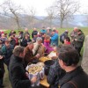 Pot pa smo nadaljevali čez Novi grad, Goreljce in skozi Budno vas in ob 10.45 prispeli po enajstih kilometrih pešačenja na Brunk. Na domačiji Skoporc-Zavrl smo se pogreli in ob enajsti uri udeležili jubilejne desete Ambroževe maše v znameniti cerkvi Sv. Treh kraljev. Začetek slovesnosti je pričel mladi glasbenik na harmoniki Matija Lazar s pesmijo Čebelar. Sledili so pozdravi predstavnikov vseh treh čebelarskih društev Bregarja, Metelka, Umeka, predstavnika občine Radeče g. M. Prnaverja. Predsednik ČD Radeče g. G. Bregar pa je podelil zahvale ČZS za desetletno sodelovanje na tej prireditvi župniji Radeče, pevkam Solzice, občini Radeče ter domačiji Skoporc-Zavrl. Po bogoslužju v čast sv. Ambrožu- zavetniku čebelarjev, ki ga je vodil radeški župnik g. Bergelj v spremstvu kolegov iz Sevnice in Svibnega pa smo se v veselem druženju pogreli ob domačih dobrotah, kuhanem vinu in čaju ter okušanju raznih medov pred cerkvijo.