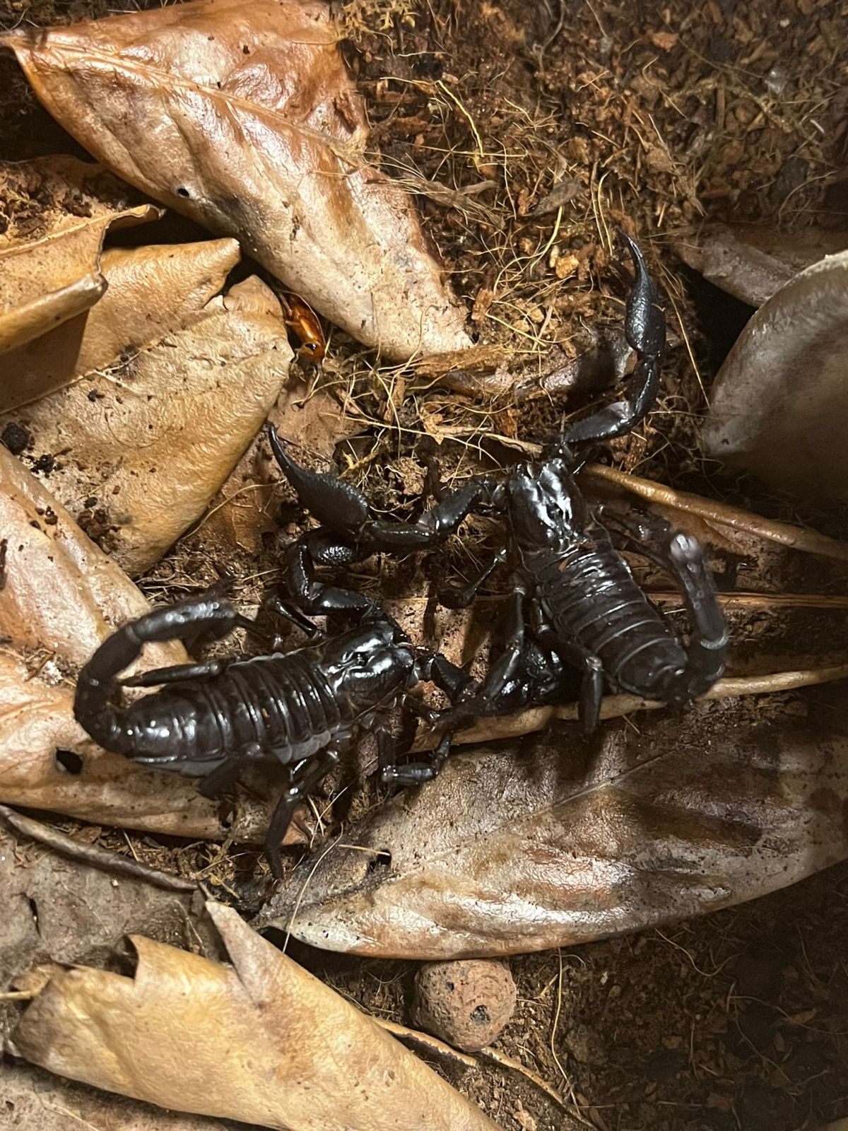 Prvi orjaški azijski škorpijoni so kot mladiči v Tropsko hišo prišli iz živalskega vrta Ostrava na Češkem. Do danes so se večkrat levili, zamenjali staro ogrodje in rasli. Samica te vrste je pred dnevi skotila tudi prvo leglo 18 mladičev.