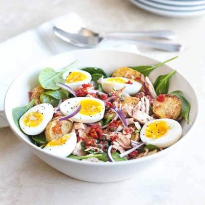 Losos s solato iz mladega krompirja, koruze in paradižnika