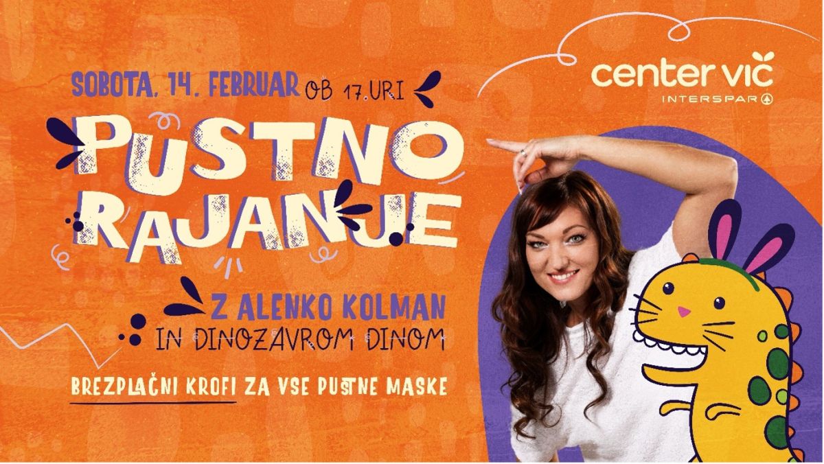 Pustni vikend bo v Centru Vič tudi letos že tradicionalno pester. To soboto, 14. februarja, bo od 17. ure dalje vse v znamenju glasbe, plesa in smeha. Za zabavo bosta poskrbela Alenka Kolman in priljubljeni dinozaver Dino, ki bo z otroki zaplesal vsem dobro poznani Dinozavrov ples in jim pokazal, kako si umiva zobke, telovadi s prijatelji dinozavri in šteje do 10. Alenka pa bo zapela znane otroške hite, kot so Biserni zobki, Gibalček, Valček števil, Semafor in številne druge. Vse pustne maske se bodo lahko brezplačno posladkale s slastnim pustnim krofom.