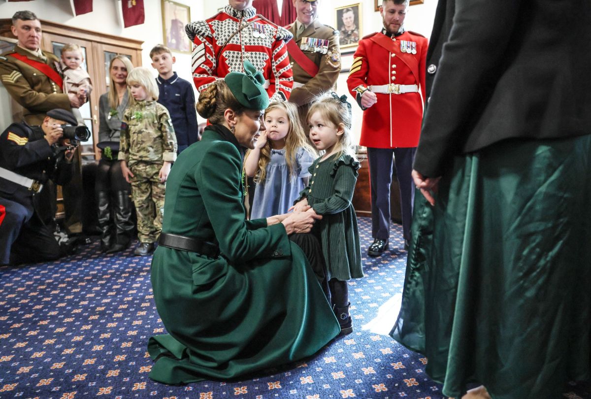 Kot častna polkovnica Irske garde se je Kate Middleton tudi letos udeležila tradicionalne parade. Za slovesno priložnost je izbrala smaragdno zelen plašč z ujemajočim se klobukom, ki je poudaril simboliko praznika. Nosila je zlato broško v obliki deteljice, simbol enote, videz pa dopolnila s svežim šopkom deteljice.