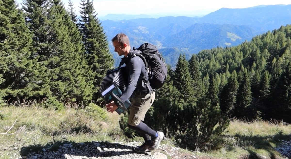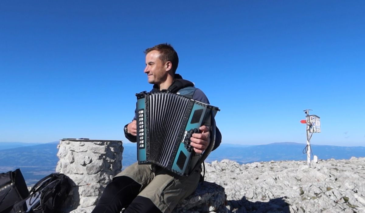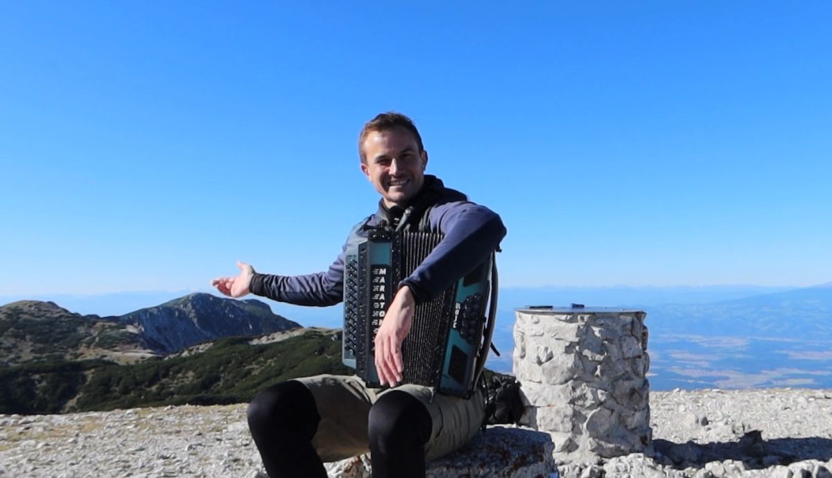 Harmonika Maratonika je v teh dneh Anžetova stalna spremljevalka. Nič čudnega, da se je z njo odpravil tudi na Peco in na vrhu zaigral ob prelepem razgledu.
