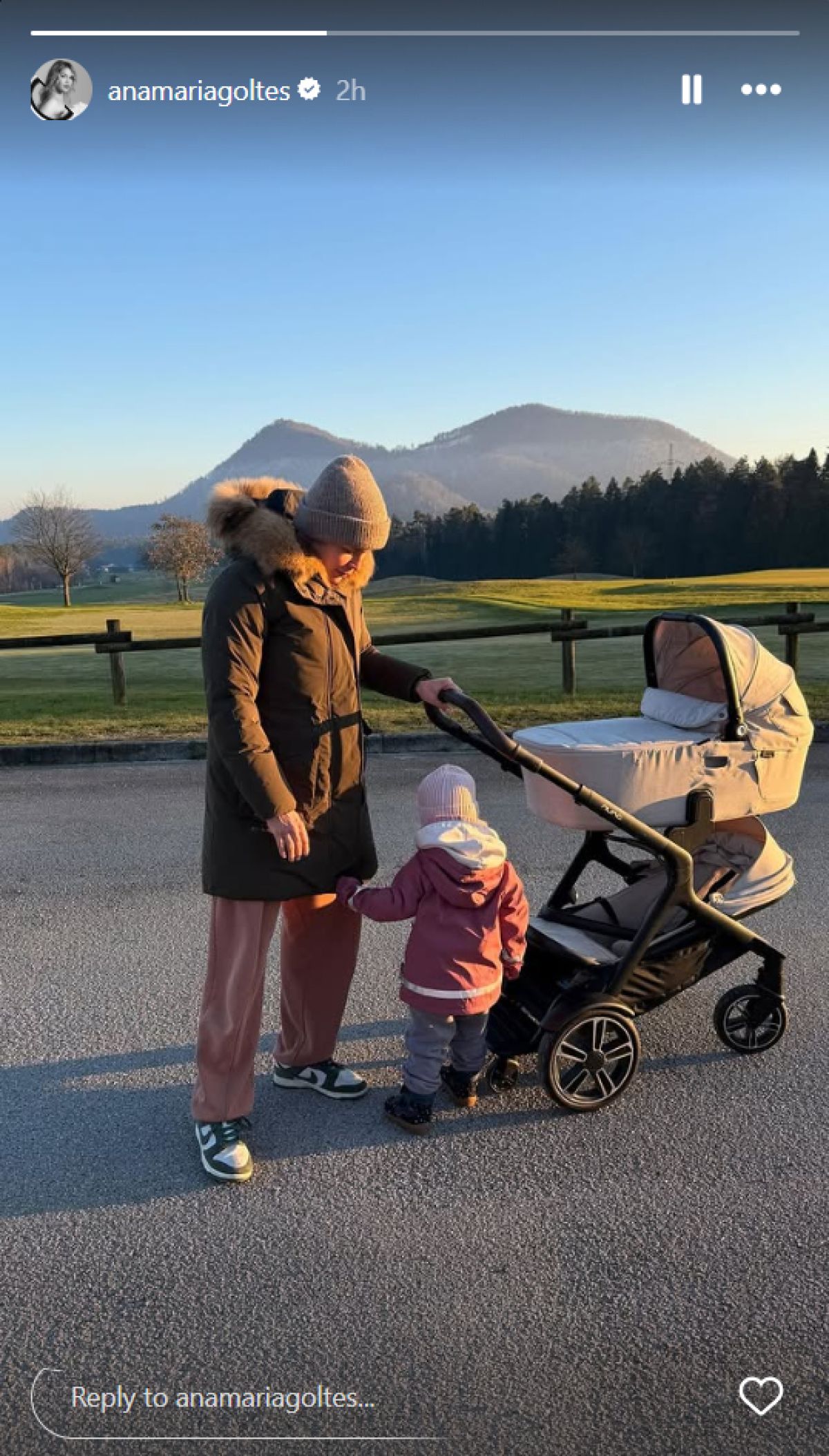 Anamaria Goltes je fotografijo objavila na svojih Instagram zgodbah. Na njej je ujela sproščen družinski trenutek med sprehodom z vozičkom in starejšo hčerjo Gabrielo v idiličnem naravnem okolju. V ozadju se jasno vidi Šmarna gora, kar dodatno potrjuje, da družina te dni uživa v Sloveniji. Fotografija je bila najverjetneje posneta v bližini njihovega družinskega doma v okolici Ljubljane, kjer Anamaria z otrokoma očitno izkorišča lepe zimske dni in svež zrak.