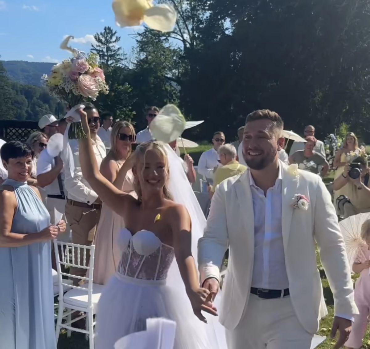 Čeprav sta se Tia in Gregor uradno poročila že v torek, ko sta na matičnem uradu ob prisotnosti svojih prič – med njimi je bil tudi Tijin brat, vplivnež Mark Vlahovič – podpisala poročne papirje, je bilo prav nedeljsko slavje tisto, ki je nosilo vso težo čustev, tradicije in prazničnega vzdušja. Tia jena moroki nosila kratko obleko s korzetom iz čipke, primerno za vročo zadnjo junijsko nedeljo v letošnjem letu. Ženin pa je bil z njo usklajen v belo-bež kombinaciji.