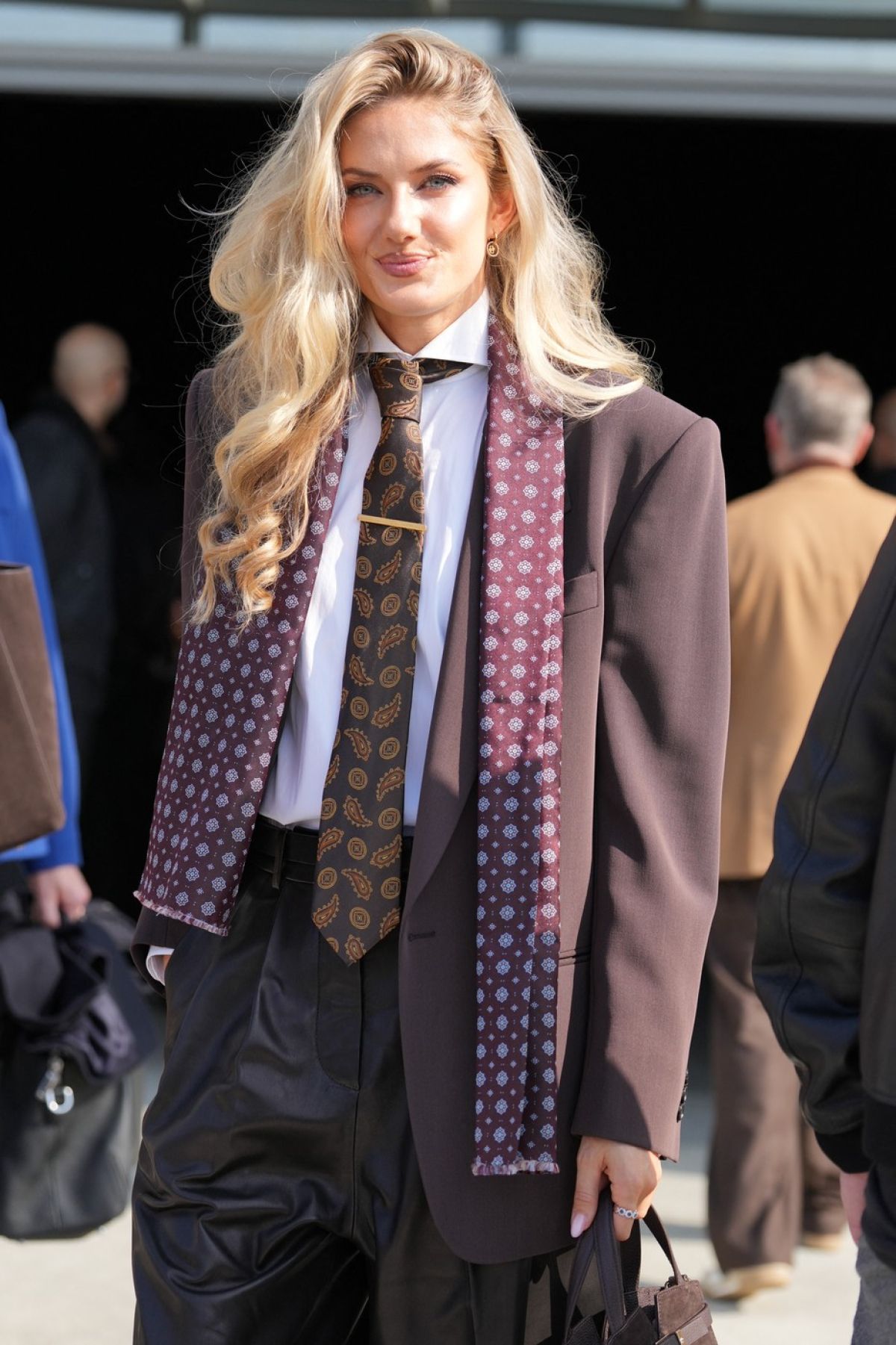 V Milanu se je pojavila v skrbno izbrani opravi modne znamke Boss. Nosila je široke črne usnjene hlače, ki jih je kombinirala z rjavim suknjičem z opaznim vzorcem na podlogi. Celoten videz je dopolnila z belo srajco s kravato in črno torbico.