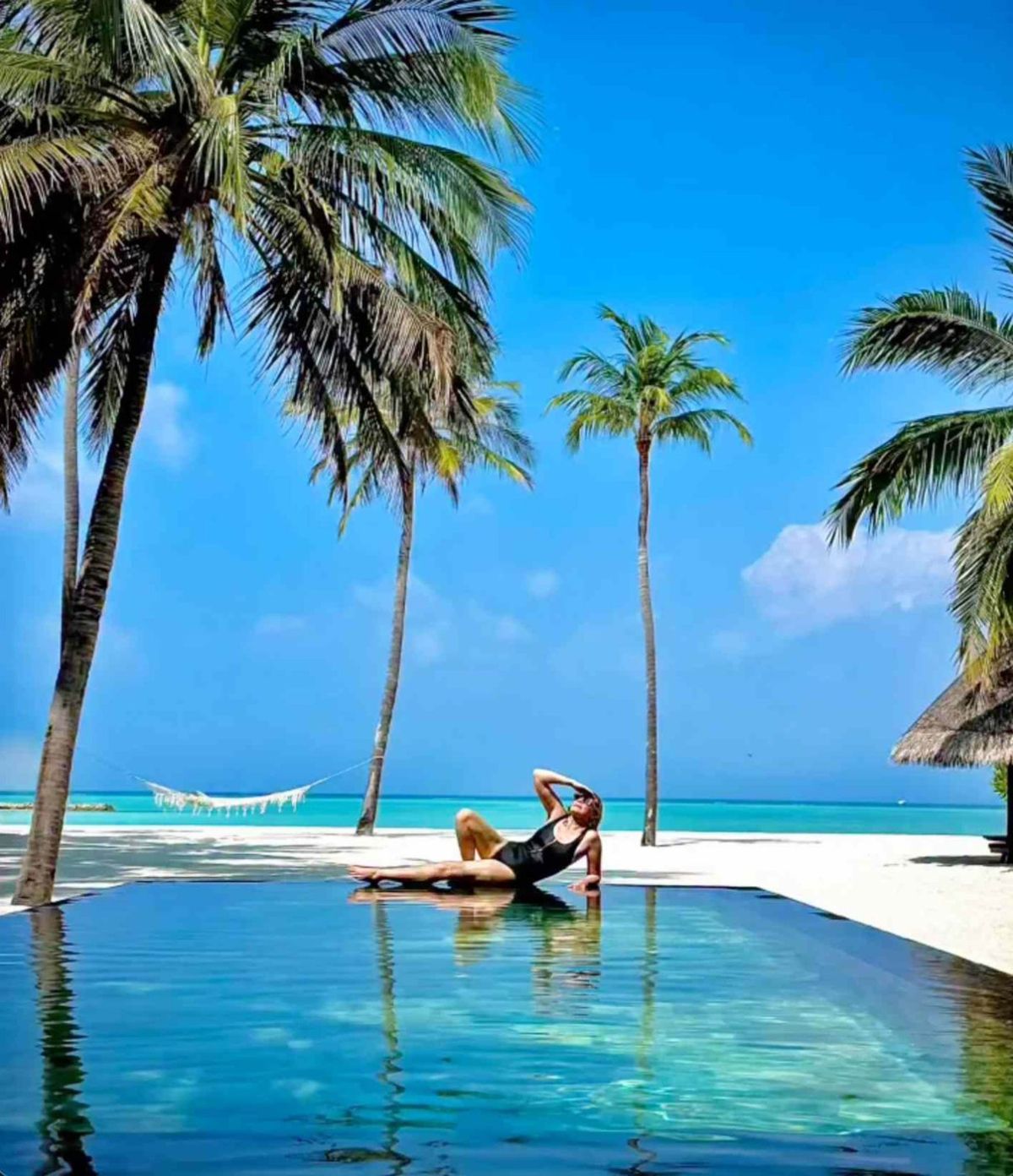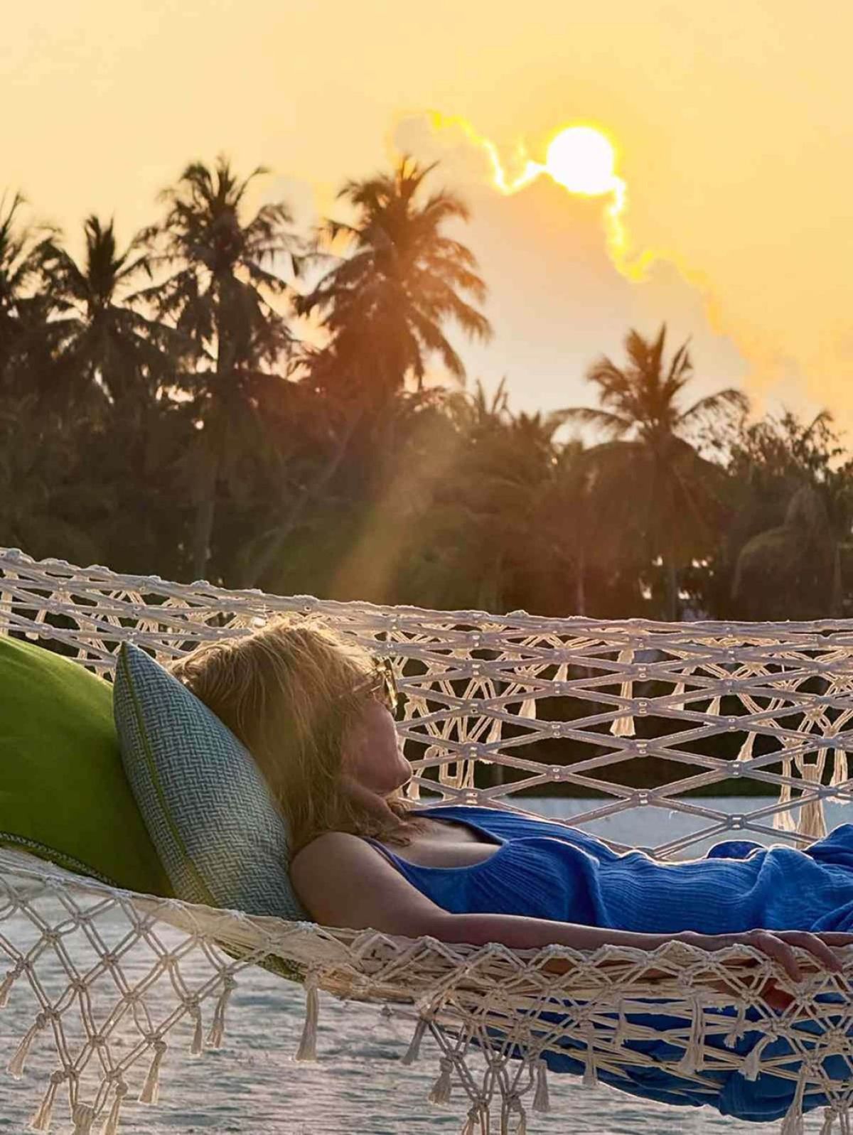 Če sta skrivala poroko, pa je igralka bolj odprta glede svojih medenih tednov. Tako je te dni presenetila z objavo z Maldivov, od koder je objavila kar dve fotografiji; na eni pozira v črnih enodelnih kopalkah, na drugi pa v viseči mreži uživa v sončnem zahodu.