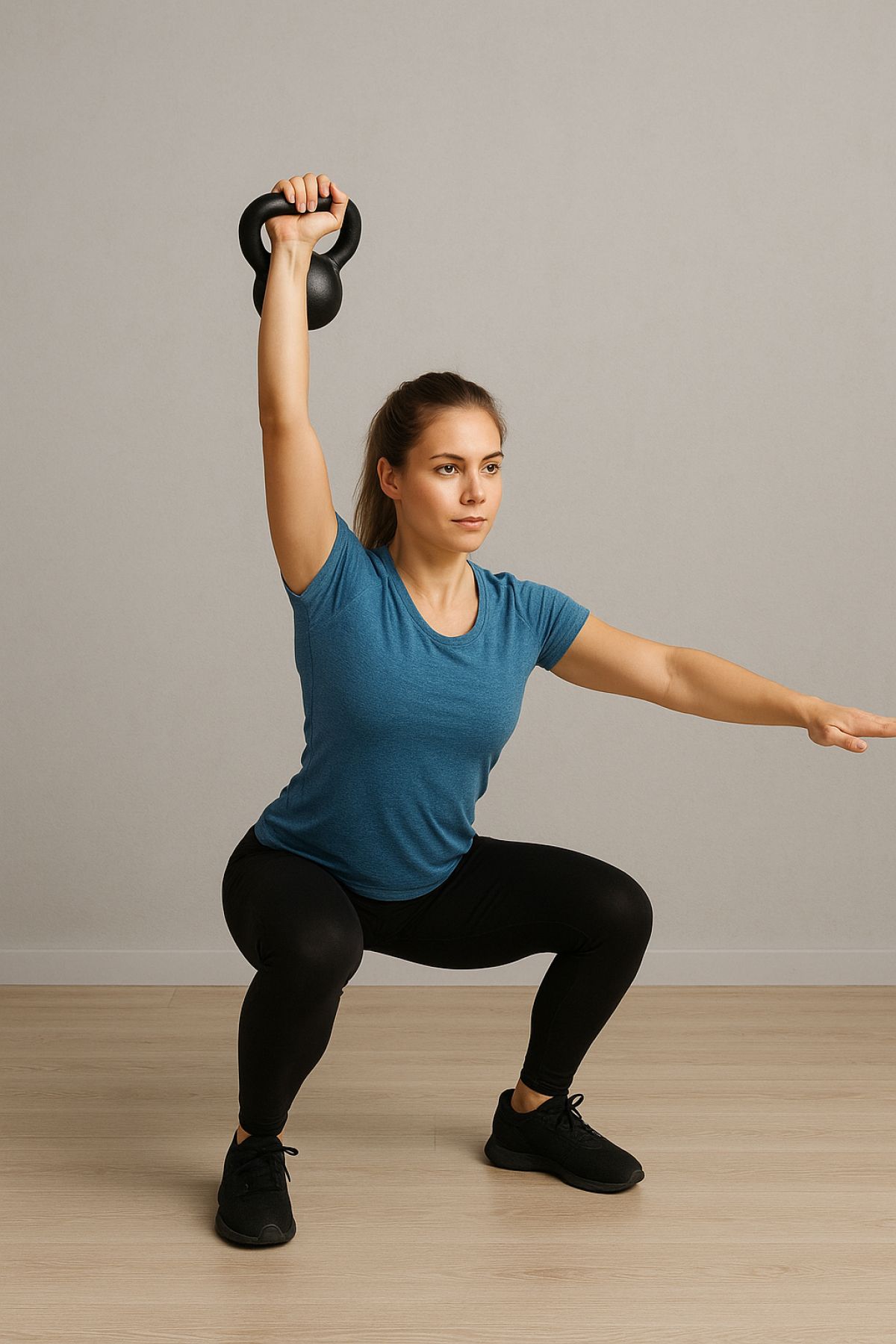 V eno roko primite utež in jo držite ob rami, komolec naj bo rahlo pred trupom. Stopala so v širini ramen. Spustite se v počep, pri čemer ohranite raven hrbet in stabilno jedro. Iz spodnjega položaja se eksplozivno dvignite in hkrati iztegnite roko nad glavo, dokler ni utež neposredno nad ramo. Nato utež nadzorovano spustite nazaj k rami in se ponovno spustite v počep. Gib naj bo usklajen, brez prevelikega usločanja v križu.