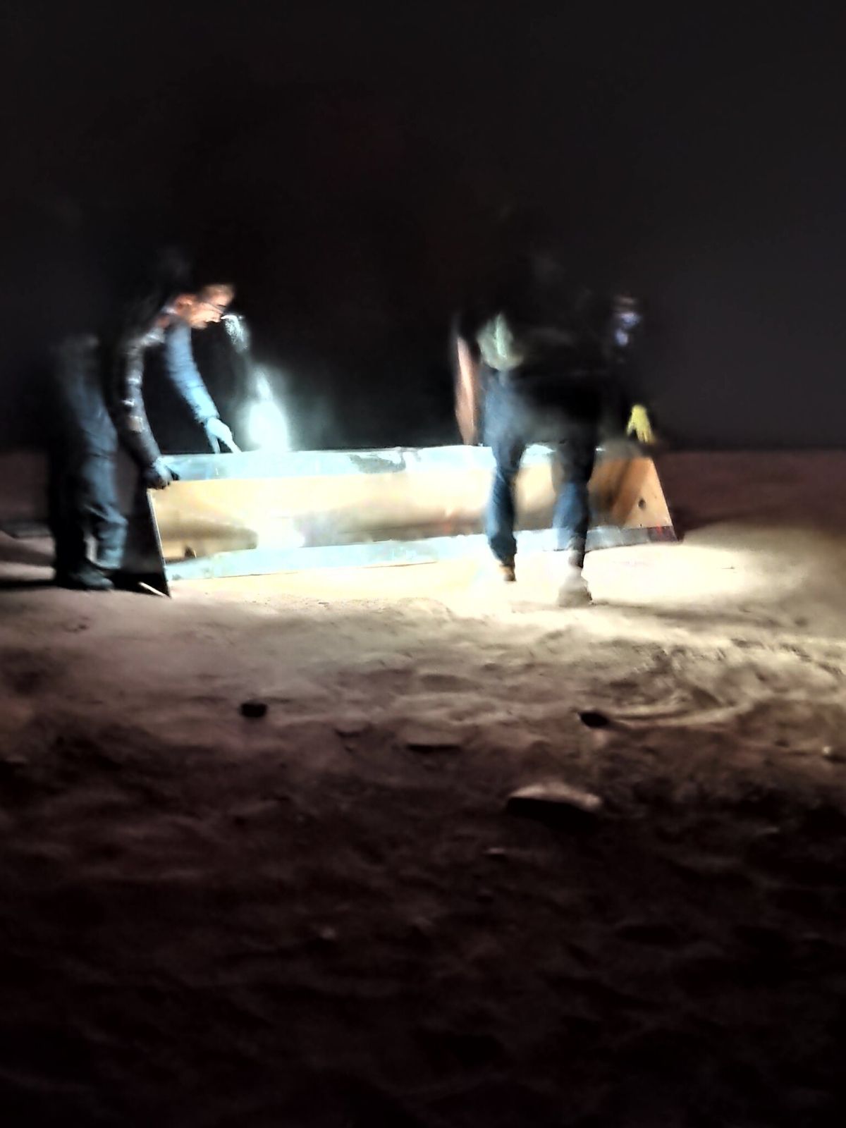 Po dva sta se postavila na vsako stran monolita in začela po njem najprej udarjati z močnimi udarci, potem pa so ga poskušali izruvati. "To je razlog, da v puščavi ne puščaš smeti," je enega izmed moških slišal reči Ross Bernards. Monolit je nazadnje popustil in padel na tla z močnim treskom, potem pa ga je četrverica razstavila, pri čemer se je pokazalo, da je monolit votel oziroma, da je narejen iz lesenih plošč, obloženih s kovinskimi. Dele monolita so naložili na samokolnico in jih odpeljali, je povedal Ross, ki je enega izmed četverice slišal reči: "Zakrijte vse sledi." Ross četverice ni hotel posneti s kamero, je pa zato njegovemu kolegu, Michaelu, to uspelo.