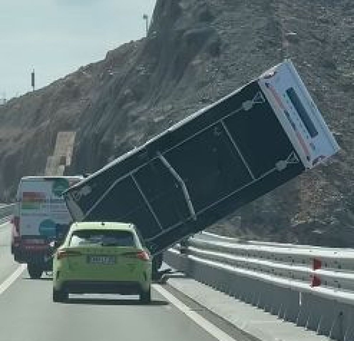Voznik kombija s počitniško prikolico je ignoriral prepoved ali pa zanjo ni vedel. Okoli 14.30, ko so sunki burje švigali s hitrostjo 140 kilometrov na uro, je zapeljal na krški most, a ga ni prevozil. Sunek vetra je namreč prevrnil prikolico, ki je obvisela na zaščitni ogradi.