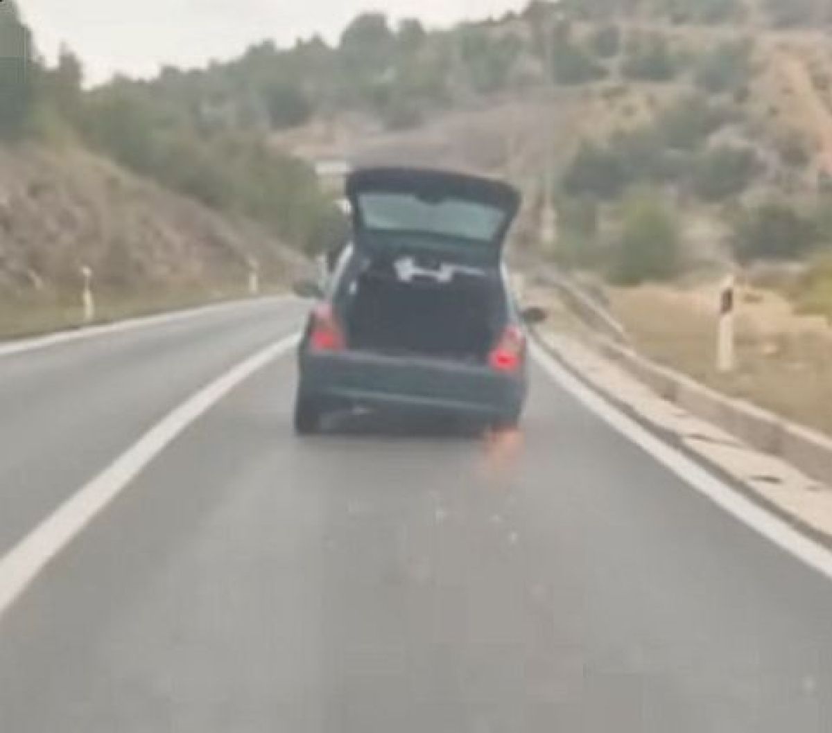 V nedeljo nekaj po 12. uri je svojega clia priganjala po cesti kar brez prednje in zadnje desne pnevmatike. Prehitevala je čez dvojno polno črto, iz neznanega razloga imela odprt prtljažnik, iskre pa se letele sem in tja, kot nekoč pri formuli ena.