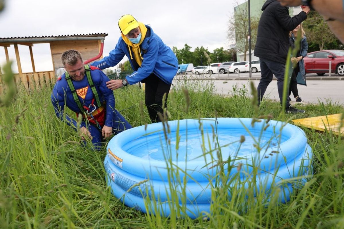 Seveda se to ni zgodilo. Avdić je s prevezo čez oči in v kostumu superheroja pristal na zelenici pred radijem. Misleč, da skače iz solkanskega mostu, se je v resnici pognal v napihljiv otroški bazenček, napolnjen z vodo! Reakcija Deželaka, Anje Ramšak in Jane Morelj, ko so ga zagledali zmedenega in popolnoma premočenega na travi, je bila neprecenljiva. Ampak vsi so se na koncu strinjali, da gre za resnično dober namen. »Slovence pozivamo, da v čim večjem števil pošljemo sms POMAGAM1 ali POMAGAM5 na 1919. Vsak SMS in vsak evro šteje, na ta način, ni junak le Deželak, ampak smo junaki vsi, ki bomo otrokom omogočili nekaj dni brezskrbnih počitnic na morju,« so sklenili v en glas.
