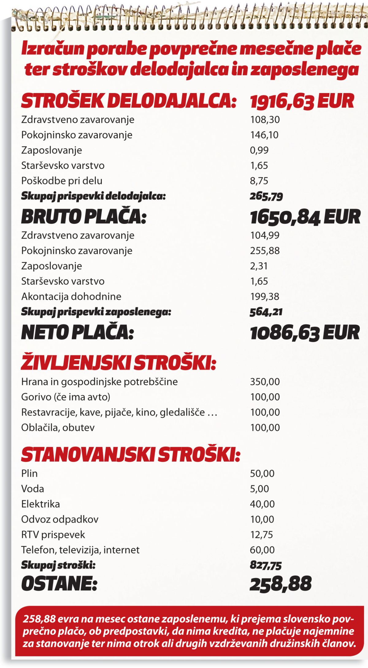 Lojze torej vsak mesec razpolaga z dobrim tisočakom evrov. Človek bi rekel, pa saj ni tako slabo. Ali res ni? Sestavili smo seznam vseh mesečnih stroškov, ki jih ima naš slovenski povprečnež. Zajeli smo vse od hrane in pijače pa do stroškov oblačil in obutve, goriva za avto, kosil, kav, obiskov kina, tudi stroške za zemeljski plin, vodo, elektriko, odvoz odpadkov, telekomunikacijske storitve … Okvirni Lojzetovi mesečni stroški so nanesli 827,75 evra. Po vseh odštetih stroških se lahko Lojze zabava še z 258,88 evra. Daleč od tega, da bi bilo slabo, boste rekli, sploh če še enkrat ponovimo podatek o dveh tretjinah ljudi, katerih plača je nižja od povprečne, torej jim na mesec ne ostane toliko, kolikor ostane našemu Lojzetu. Pa povprečnemu Slovencu res ostane toliko na koncu meseca? Pozor, izračun ni zajemal kredita za stanovanje ali kakršnekoli stanarine, pri izračunu smo upoštevali tudi, da oseba nima otrok ali drugih vzdrževanih družinskih članov. Končni izračun bi bil ob teh dodatnih stroških verjetno precej drugačen, prav tako pa se je še enkrat izpostavila misel na umetnost preživetja tistih z nižjimi mesečnimi dohodki.