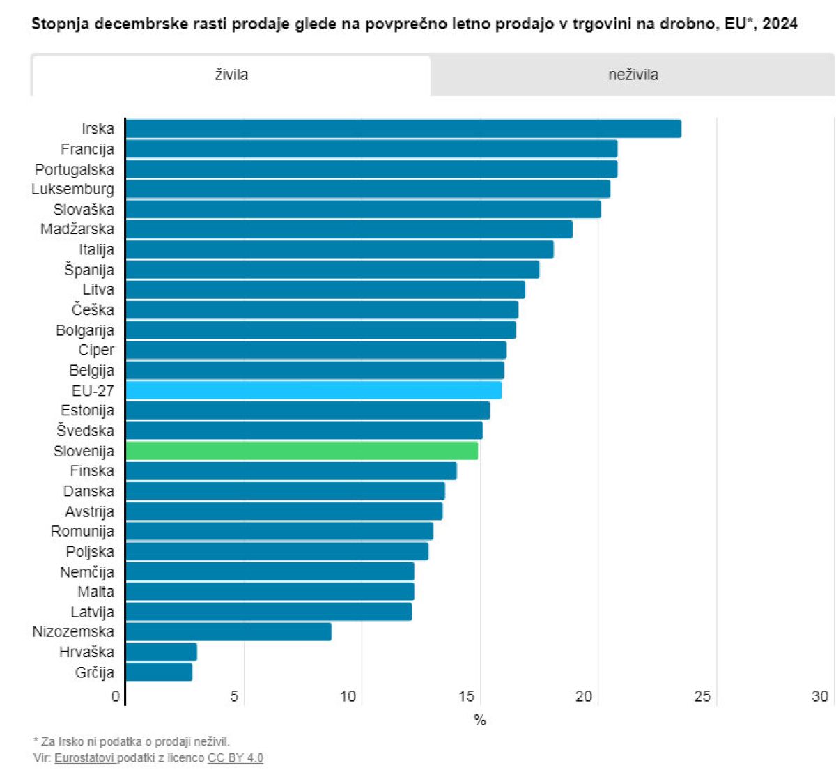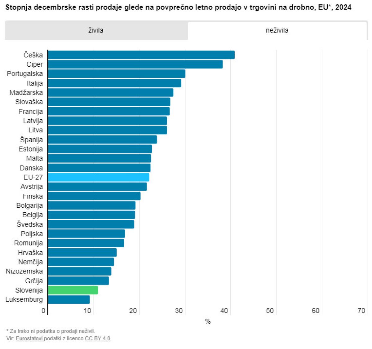 Prodaja neživilskih izdelkov je bila v Sloveniji decembra lani v primerjavi s povprečno mesečno prodajo v lanskem letu izrazito pod povprečjem EU. Evropsko povprečje pri razliki med decembrsko prodajo in povprečno mesečno prodajo v letu 2024 je znašalo 22,1 odstotka, medtem ko je razlika v Sloveniji obsegala 10,9 odstotka, kar je našo državo uvrščalo na predzadnje mesto med članicami EU, pred Luksemburgom. Po drugi strani so največjo razliko izmerili na Češkem, in sicer 40,8-odstotno.