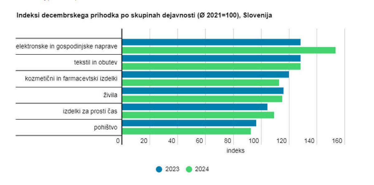 Lanski december je bil v primerjavi s predlanskim manj uspešen za večino glavnih skupin dejavnosti trgovine na drobno. Prodaja se je povečala le v trgovinah z elektronskimi in gospodinjskimi napravami (za 19,5 odstotka) ter trgovinah z izdelki za prosti čas (za 4,7 odstotka). V vseh preostalih večjih skupinah so se prihodki zmanjšali. Največji upad je bil zaznan v trgovinah s kozmetičnimi in farmacevtskimi izdelki (za šest odstotkov manj prihodkov kot decembra predlani) ter trgovinah s pohištvom (za 4,2 odstotka manj prihodkov).