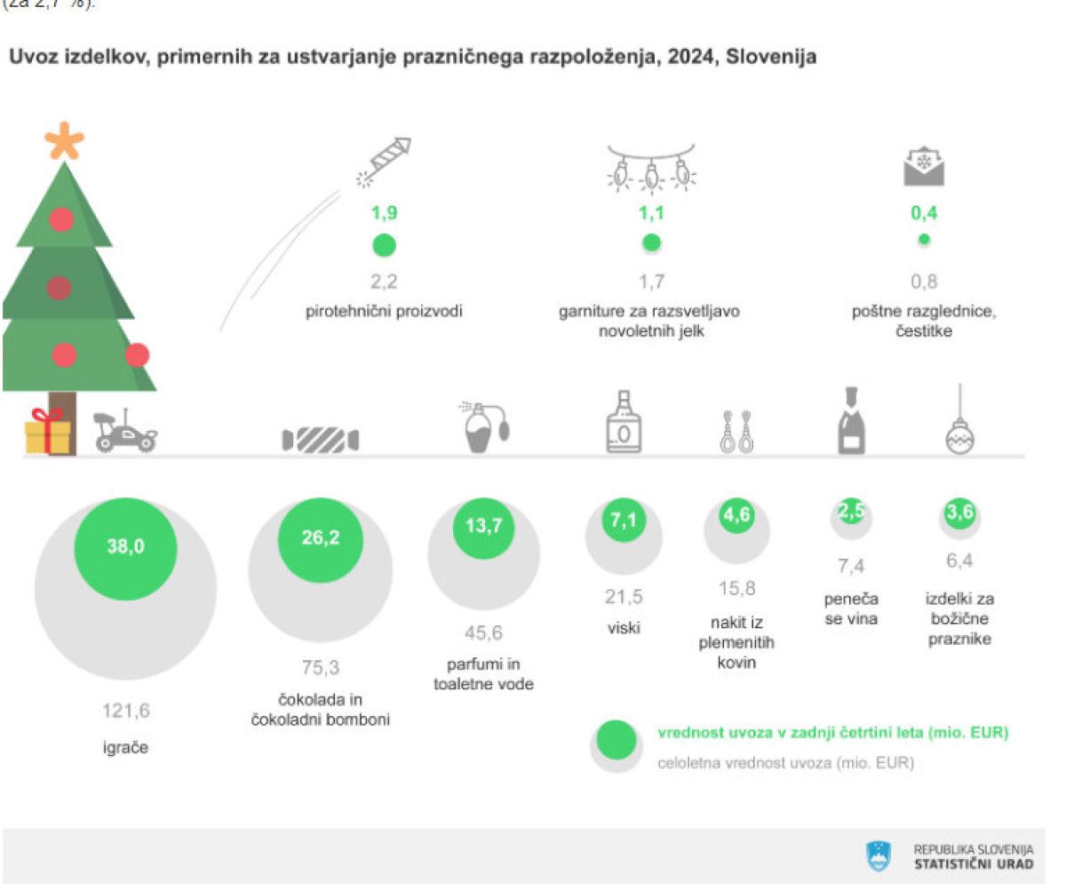 S prazničnim časom in običaji so izraziteje povezane nekatere skupine izdelkov. To je mogoče opaziti tudi pri porastu vrednosti uvoza, saj v zadnji četrtini leta uvozimo več izdelkov, primernih za darila, ter izdelkov, s katerimi ustvarjamo praznično razpoloženje. Tudi leto 2024 pri tem ni odstopalo, saj se je uvoz večine skupin proizvodov, ki jih povezujemo s praznovanjem in obdarovanjem, povečal.