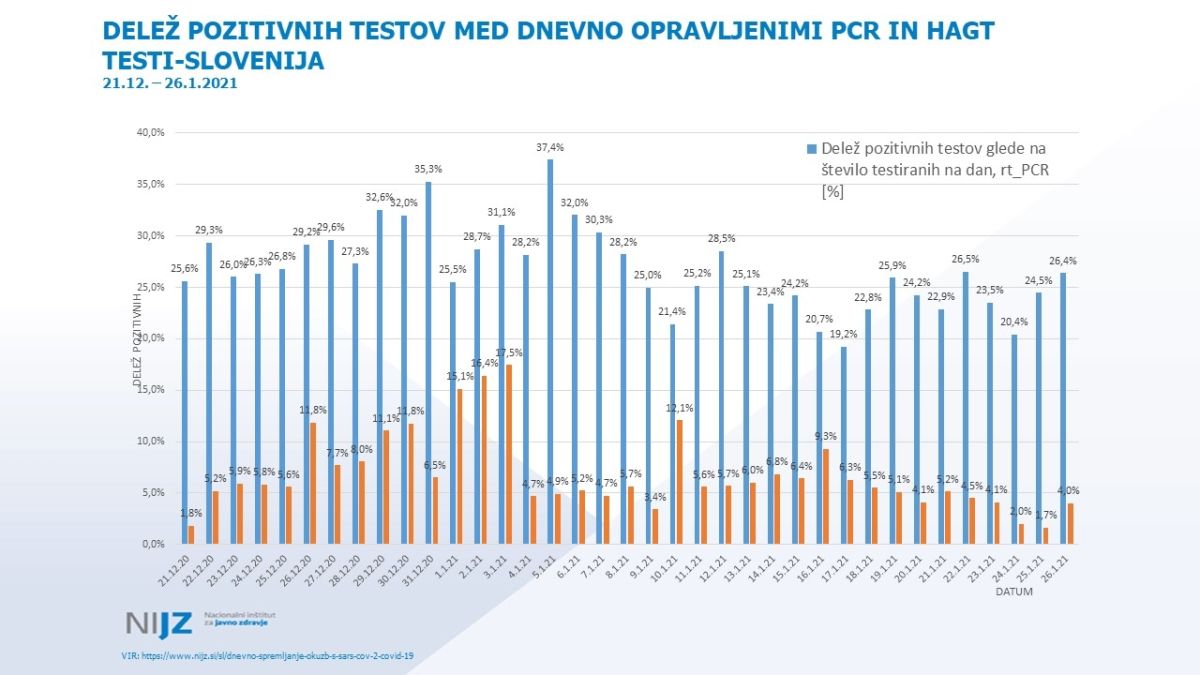Delež pozitivnih testov med dnevno opravljenimi PCR-ji vztraja med 20 in 27 odstotki, delež pozitivnih testov med dnevno opravljenimi hitrimi testi pa znaša okoli štiri odstotke ali manj.