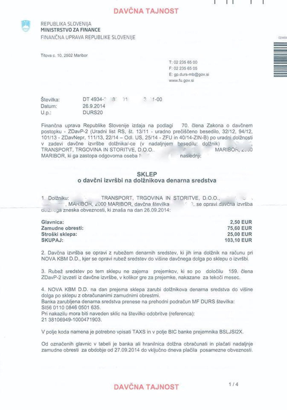 Dokaz za to je tudi odločba o izvršbi, ki se je te dni širila po omrežju Facebook. V njej so bile številke, ki so marsikoga na prvi pogled prepričale o tem, kako tiranska in nepravična je naša država. Glede na odločbo naj bi neznanemu podjetniku iz Maribora zaradi 2,50 evra dolga zaračunali kar 75,60 evra zamudnih obresti, k temu so dodali še stroške izvršbe v višini 25 evrov in mu nato z računa skupaj rubili 103,10 evra. Ob objavi na facebooku so se vrstili zgroženi komentarji državljanov. »To je pač trenutno stanje, ki ga imamo, in nič ne kaže na bolje … revež je vedno TEPEN,« je zapisal eden izmed komentatorjev.