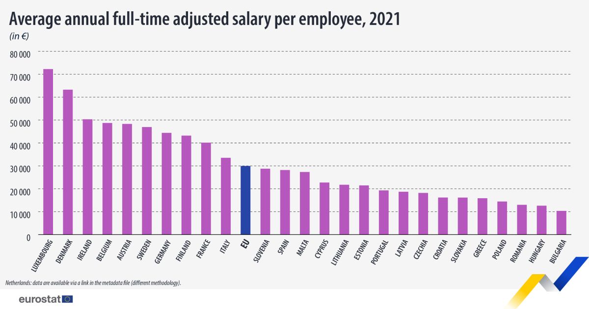 Statistična služba EU Eurostat je objavila podatke o povprečnih letnih plačah po EU. Kot je razbrati iz danes objavljenega grafa, so v letu 2021 najbolje zaslužili v Luksemburgu, v povprečju kar 72.200 evrov, odlično je šlo tudi Dancem, ki so v letu 21 v povprečju na račun prejeli 63.300 evrov, na tretje mesto zaslužkarjev so se uvrstili Irci s 50.000 evri. Najslabše se godi delavcem Bolgariji, kjer letna bruto plača komaj preseže 10.000 evrov, na Madžarskem 12.600 in v Romuniji 13.000 evrov. V celotni EU naj bi povprečna letna bruto plača znašala 30.000 evrov. Presenetljivo blizu povprečja se nahaja Slovenija, kjer naj bi po podatkih Eurostata v povprečju prejeli letni prejemek okoli 28.000 evrov. To pomeni, da so bile v letu '21 plače pri nas višje kot na primer v Španiji, na Portugalskem, Grčiji, na Češkem, v Litvi , Latviji, Estoniji....
